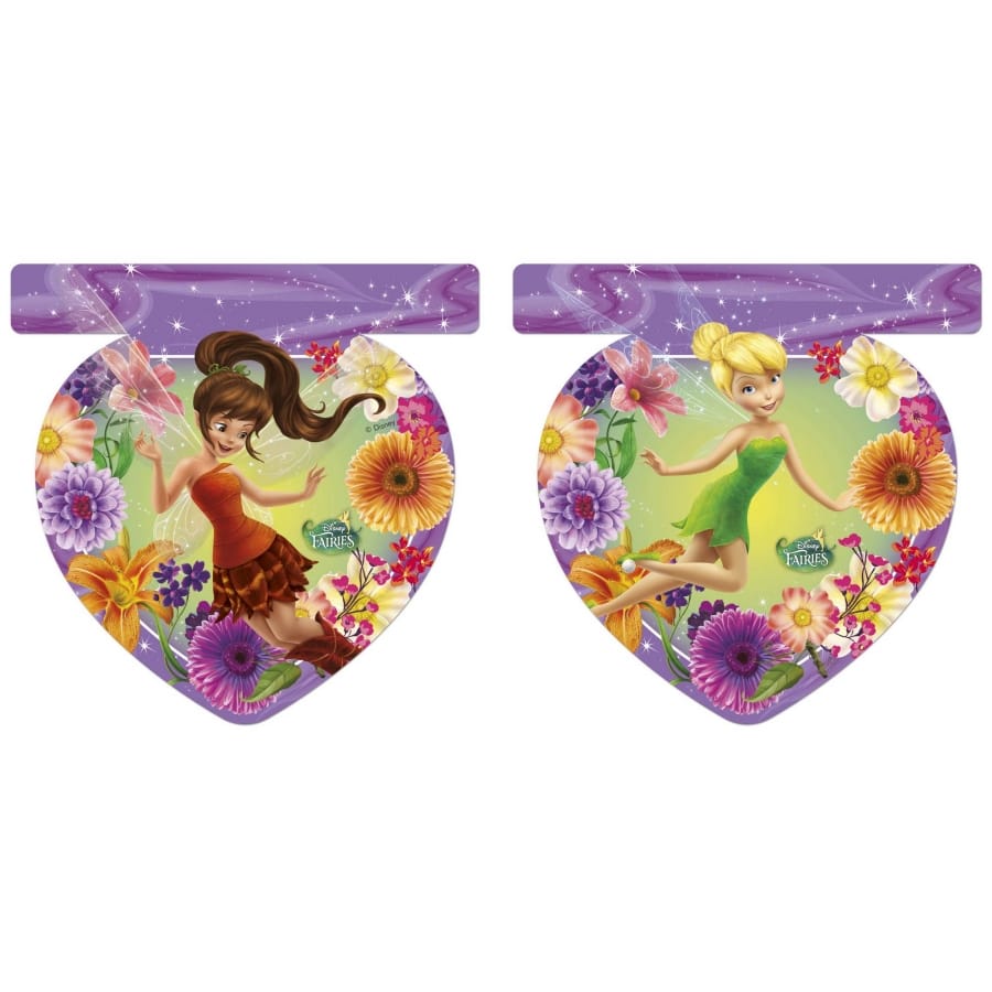 Une guirlande en plastique de 230cm avec une demi-douzaine de fanions avec Fée Clochette et Noa volées dans un champ de fleurs colorées.