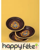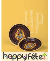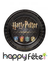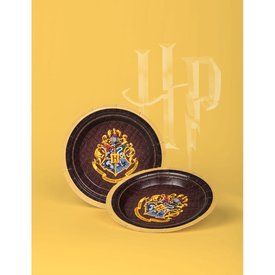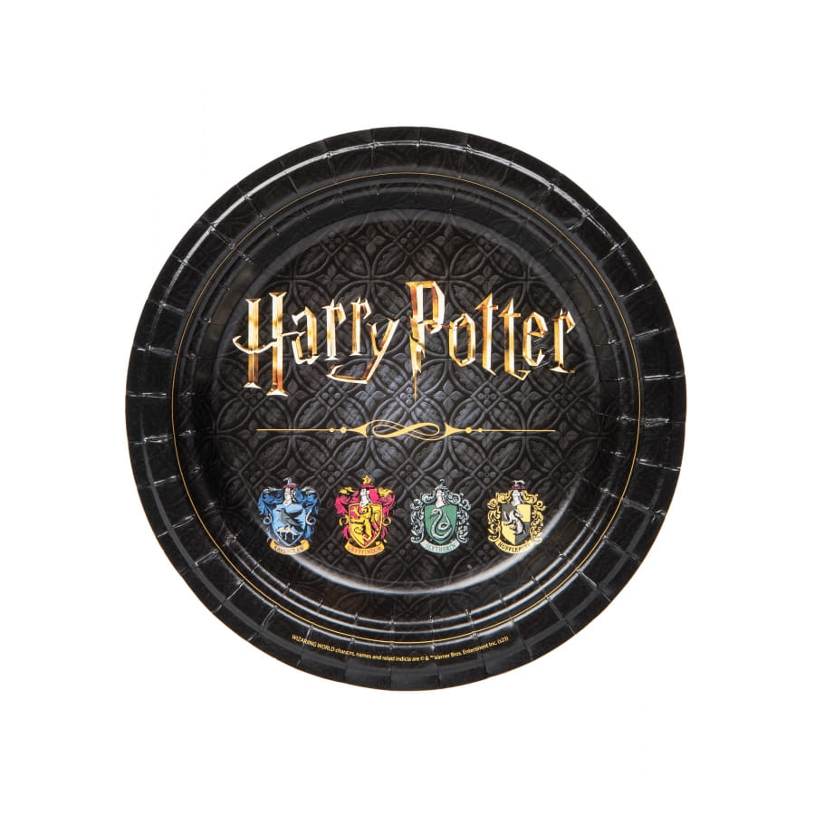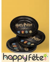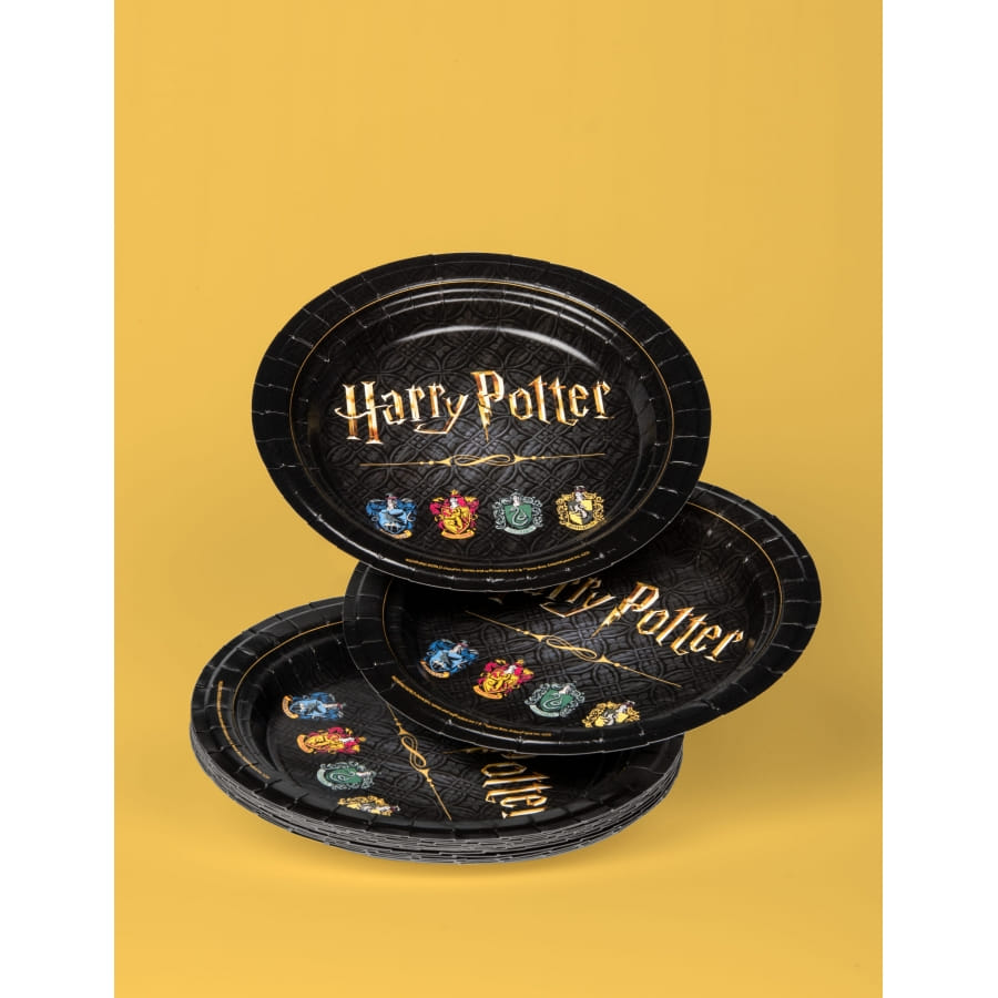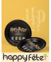 Laisse-moi te présenter notre superbe collection d'articles de fête Harry Potter. Tout d'abord, nous avons ces élégantes assiettes en carton de 23cm, aussi noires que le pelage de Sirius Black sous sa forme animagus. Elles arborent fièrement le logo Harry Potter en lettres dorées, rappelant le vif d'or. Ah, et tu as remarqué les armoiries des différentes maisons juste en dessous ? Que tu sois courageux comme un Gryffondor ou rusé comme un Serpentard, elles te rappelleront la magie de Poudlard à chaque bouchée.