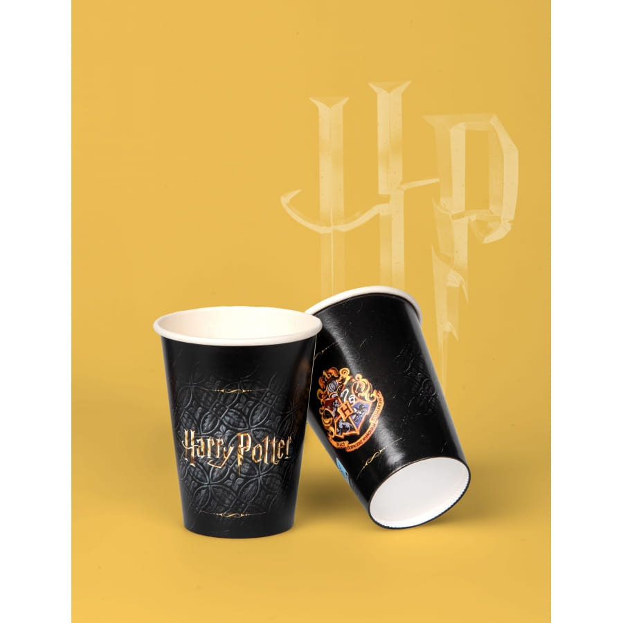 Et pour étancher ta soif après avoir chanté "Joyeux anniversaire" avec l'énergie d'un Peeves en pleine farce, nous te proposons nos gobelets en carton d'une contenance d'environ 210 ml. Comme pour les assiettes, ils sont noirs et mettent en avant le logo Harry Potter en doré, pour te rappeler que tu es bien dans une fête magique.