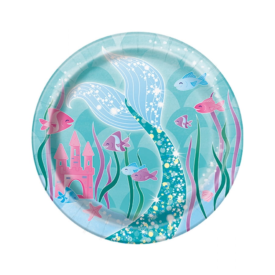 Légèrement creuses, elles sont bleues avec un château rose, des poissons et la queue d'une sirène.