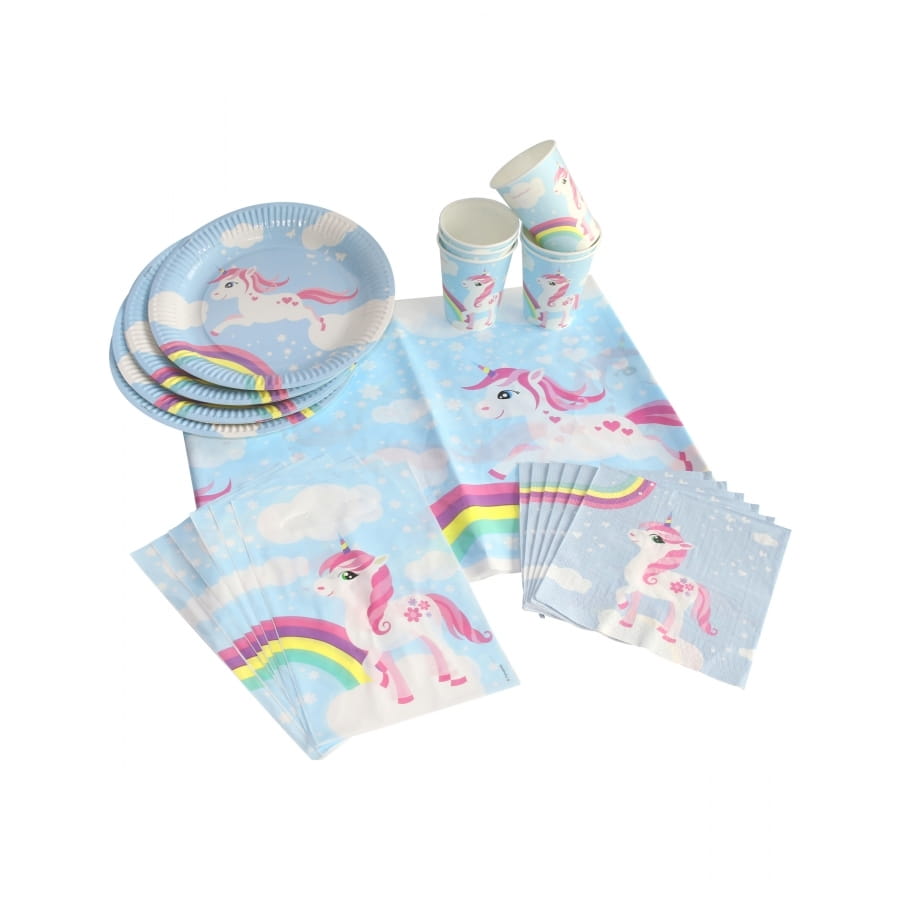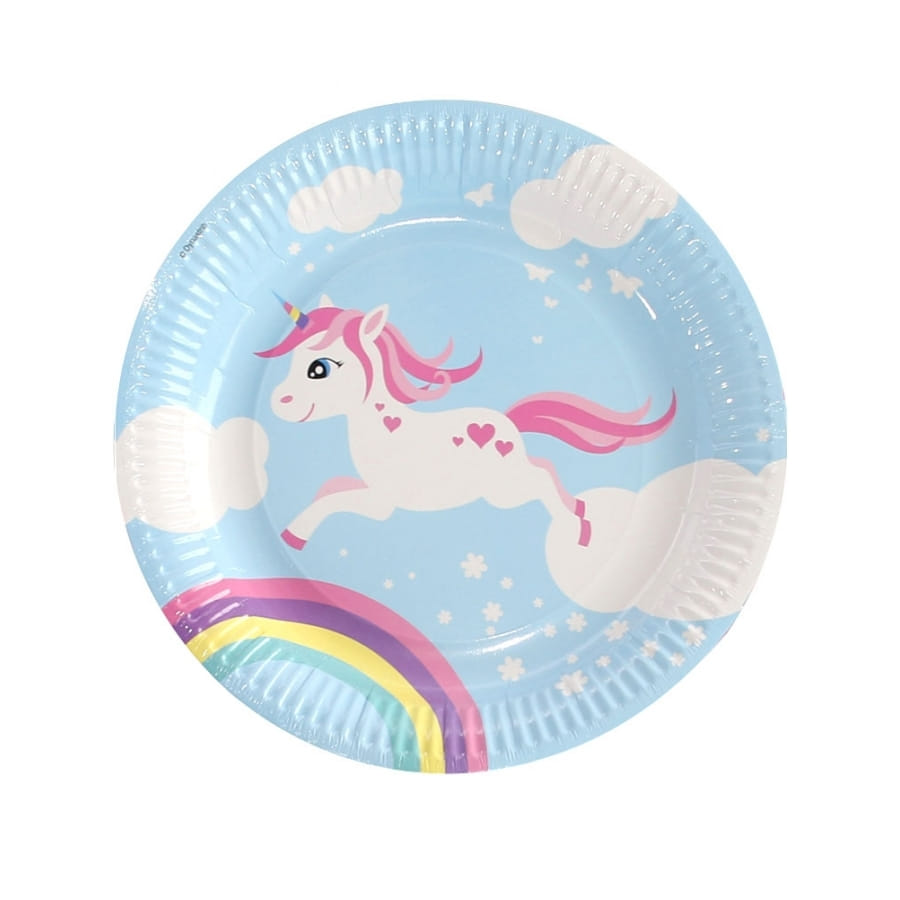Les 6 assiettes en carton mesurent 23 cm. Elles sont bleues et sont représentées par une licorne galopant de nuages en nuages accompagnée d'un arc-en-ciel.