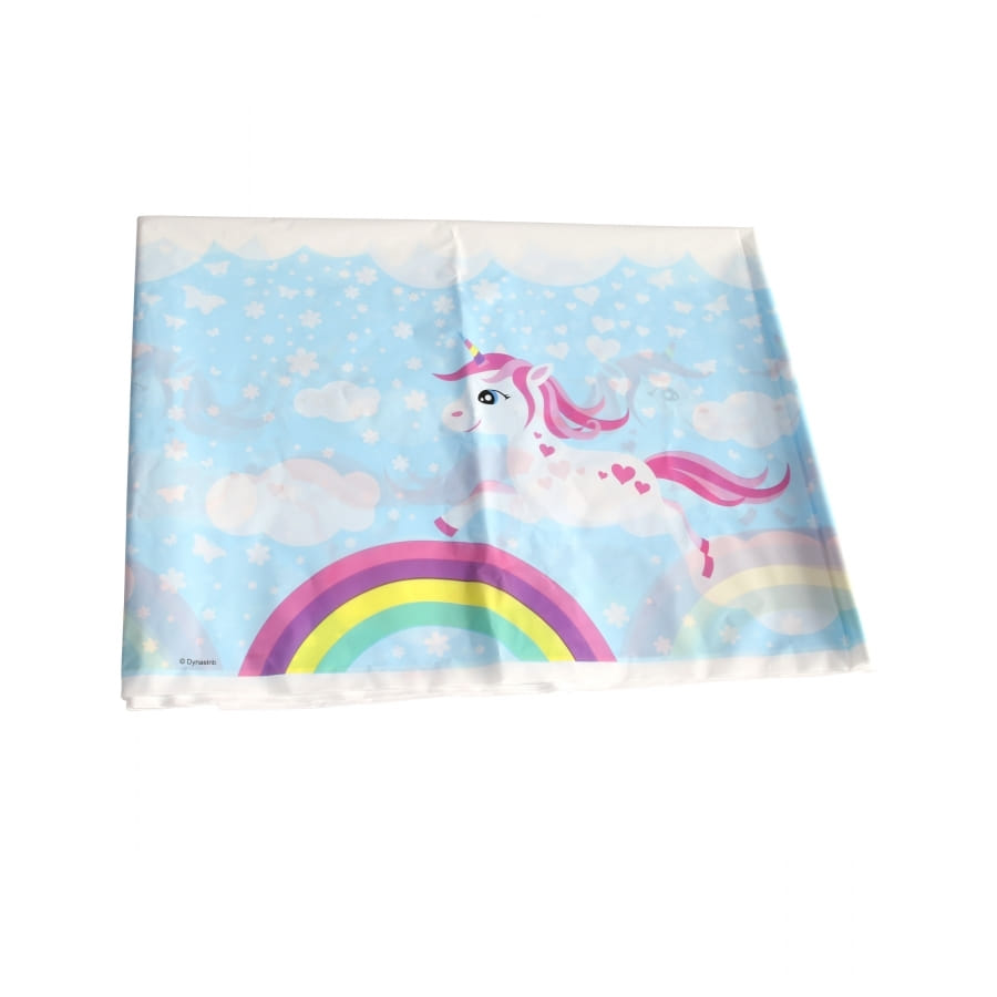 La nappe est en plastique et mesure 130 x 180 cm. Elle représente une licorne et son arc-en-ciel sur fond bleu avec des nuages blancs.