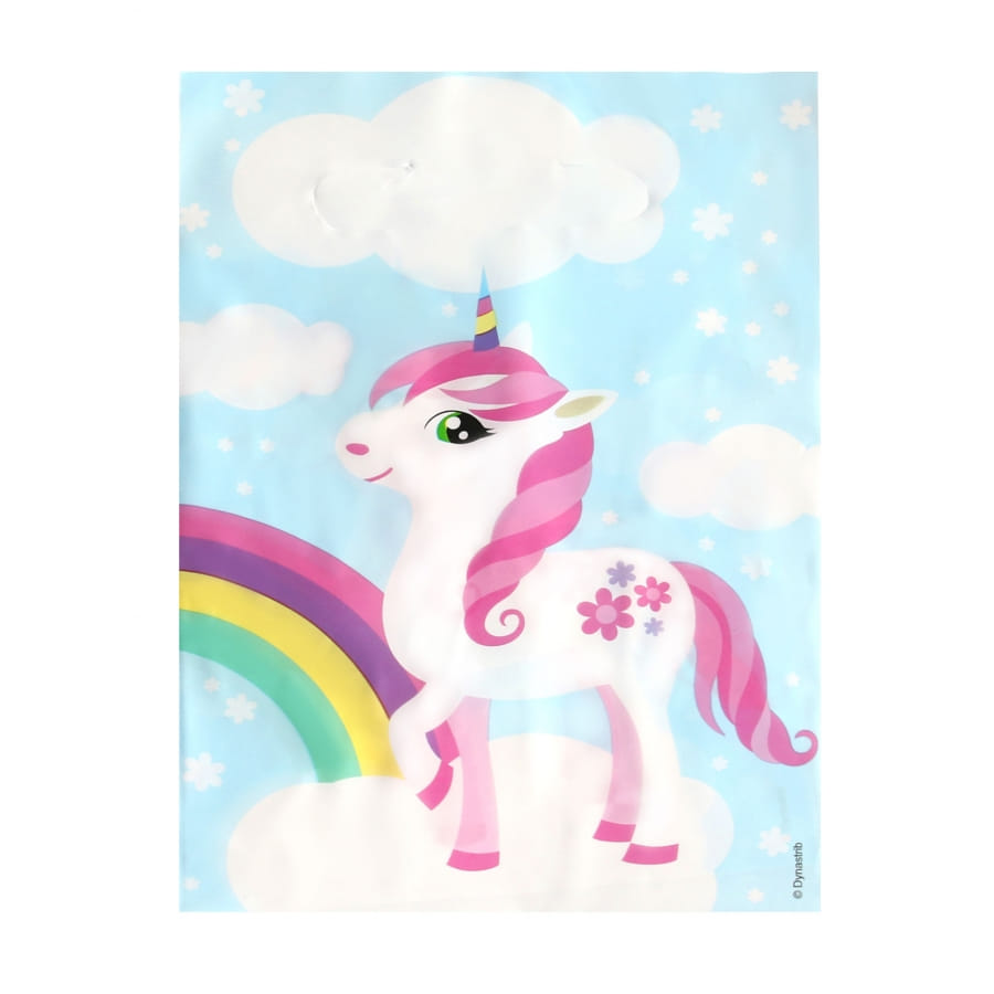 Les sacs à bonbons sont en plastiques et vendus par 6. Ils mesurent 30 x 18 cm. Une licorne sur un arc-en-ciel y est représentée entourée de nuages.