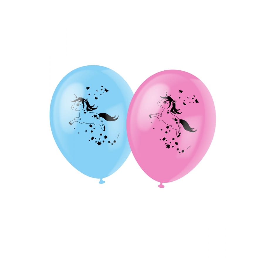 Les ballons font 30 cm une fois gonflés, avec l'image d'une licorne à la crinière noire sur un fond rose ou bleu.