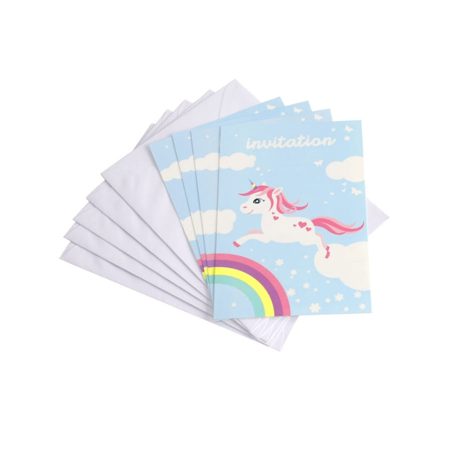 Les 6 invitations sont vendues avec 6 enveloppes et mesurent 25 x 13 cm. Elles sont représentées par une licorne et un arc-en-ciel sur fond bleu avec des nuages.