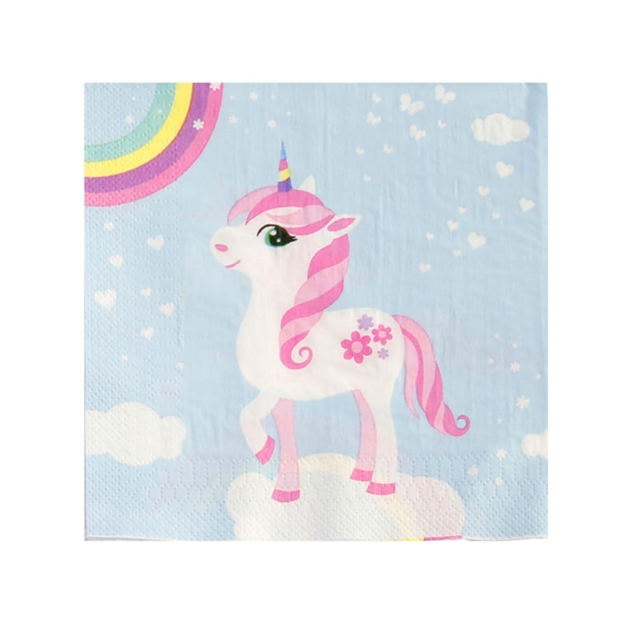 Les 20 serviettes mesurent 33 cm une fois dépliées et représentent une licorne sur son nuage avec un fond bleu et un arc-en-ciel.