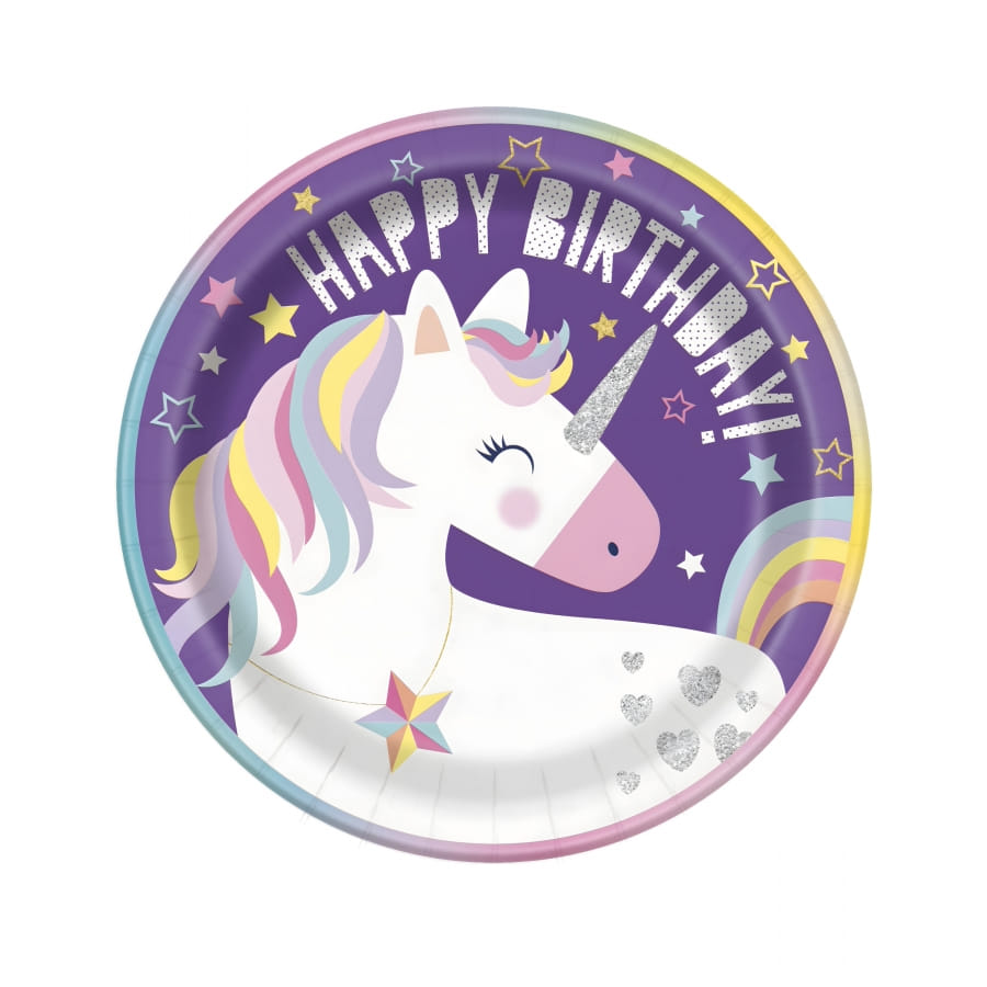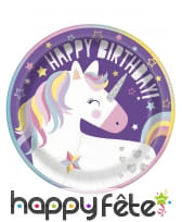 Pour commencer, dressez une table digne des plus beaux contes avec nos 8 assiettes en carton de 23cm, ornées d'une adorable tête de licorne blanche à la crinière multicolore sur fond violet et portant l'inscription "Happy Birthday".