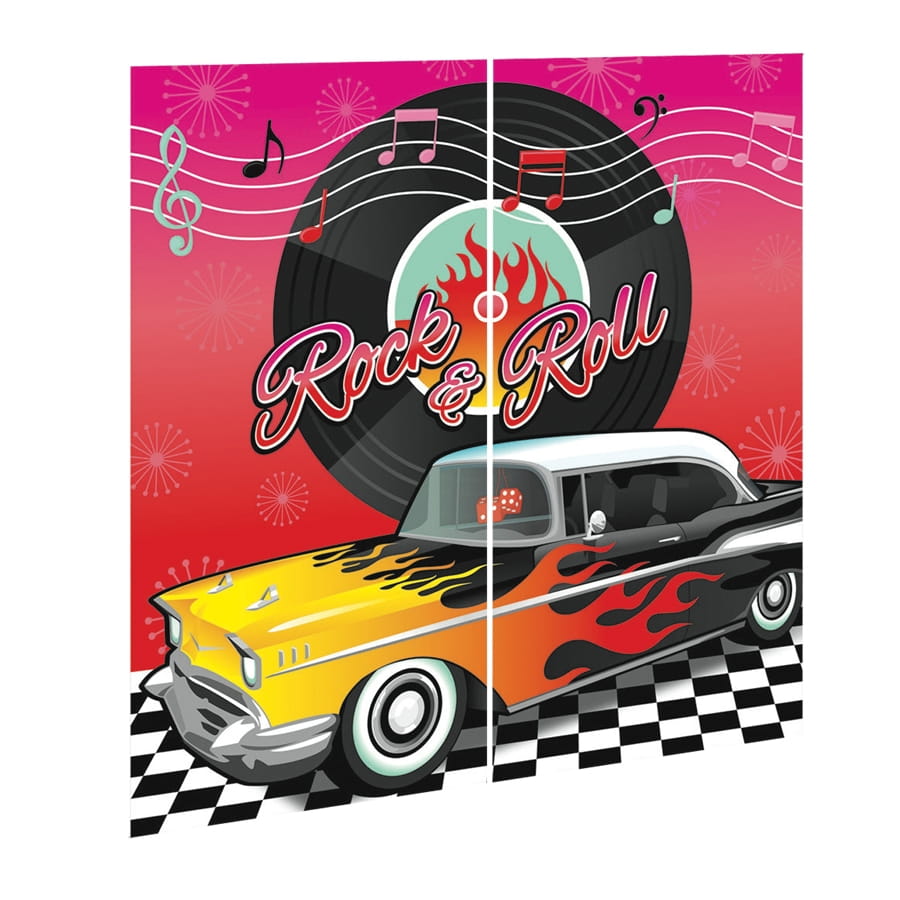 Les idées déco, on en raffole trop ! La musique est en fête avec la décoration murale rock'n roll, voiture et disque. Cet article rose reflète la musique rock des années 50-60. Il est formé de deux rouleaux mesurant 82,5 cm x 1,65 m, sur lesquels sont placés en gros plan un disque et une voiture ancienne.