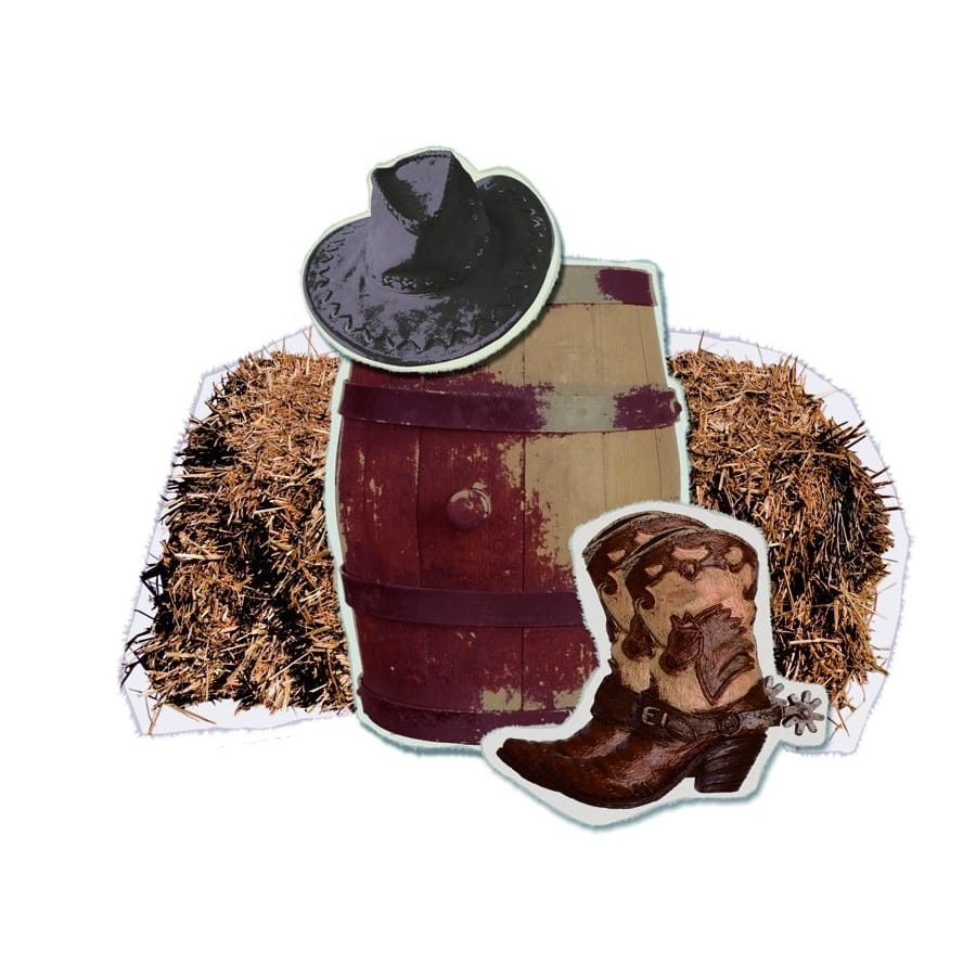 Retrouvez-vous avec des éléments typiques d'un western pour votre soirée à thème cowboy. Vous pourrez métamorphoser votre intérieur avec cette décoration murale Western baril et chapeau. Elle fait une dimension de 36 x 40 cm. Il s'agit d'un modèle de couleur marron imprimé sur les deux côtés et représentant un baril en bois, un chapeau, une paire de bottes ainsi qu'une botte de foin.