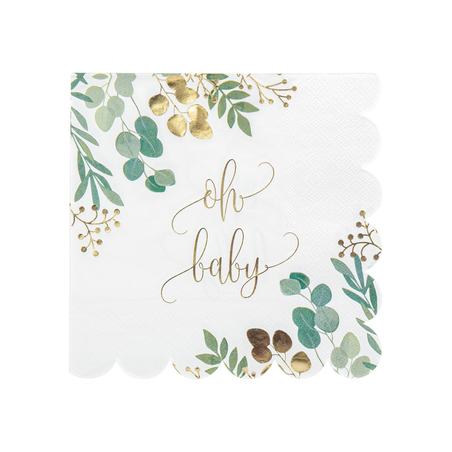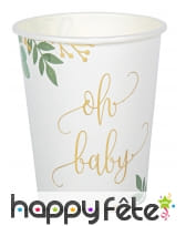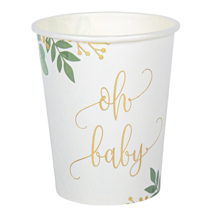 Les gobelets sont blanc avec imprimés floraux et l'inscription dorée "oh baby".