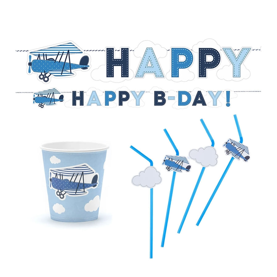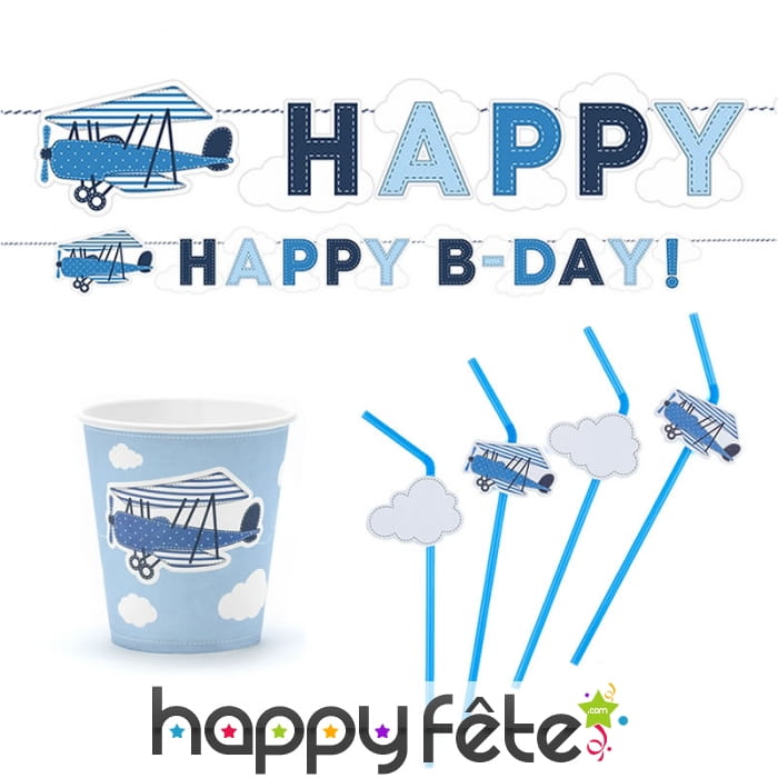 - 1 guirlande avec fanions en carton représentant un petit avion bleu et les lettres HAPPY B-DAY !.