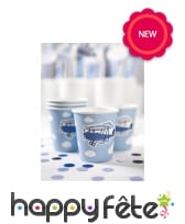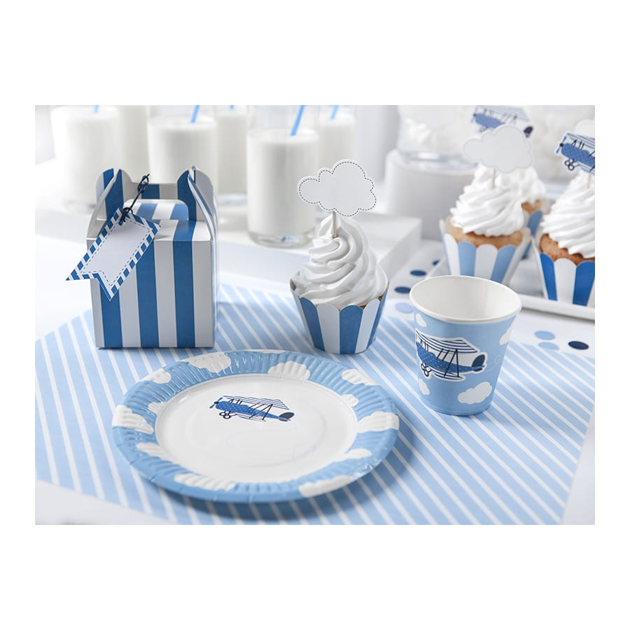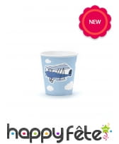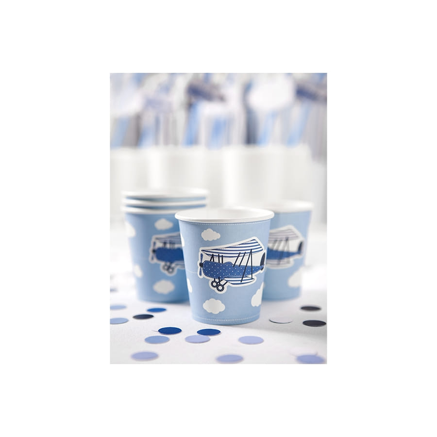 - Lot de 6 gobelets d'une contenance de 20 cl avec motifs avion bleu et nuages blancs sur fond bleu.