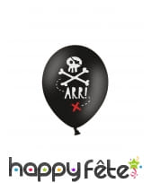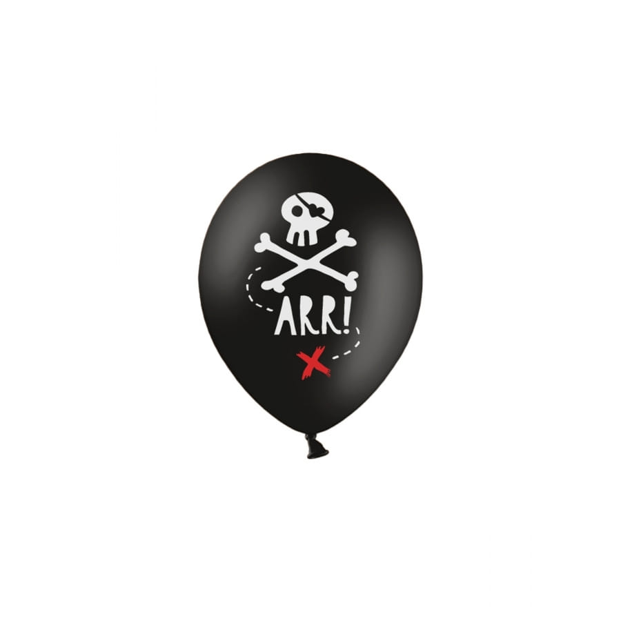 -6 ballons noirs en latex de 30cm. Une tête de mort blanche y est imprimée ainsi que le mot "Arr".