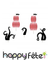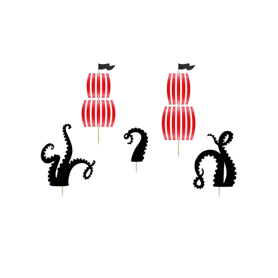 -5 cake toppers en carton composé de 3 tentacules et 2 mats de bateau de pirate avec voile à rayures rouges et blanches.