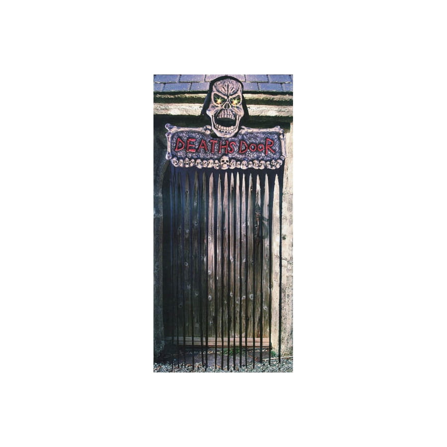 Bienvenue dans l'antre de la mort ! Laissez vos invités trembler de peur à la vue de cette décoration terrifiante. Vous disposerez d'une décoration de porte ornée d'une grosse tête de mort en haut au centre. Ses yeux seront lumineux grâce à un système d'alimentation par des piles. Il portera le nom de "DEATH DOOR", écrit en lettres capitales dessus, et est décoré de plusieurs petites têtes de squelettes. Ce modèle fait en tout 270 cm de long sur 100 cm de large. Il est totalement approprié pour une soirée d'Halloween macabre !