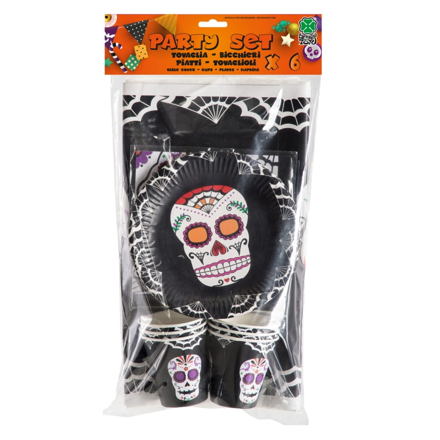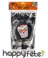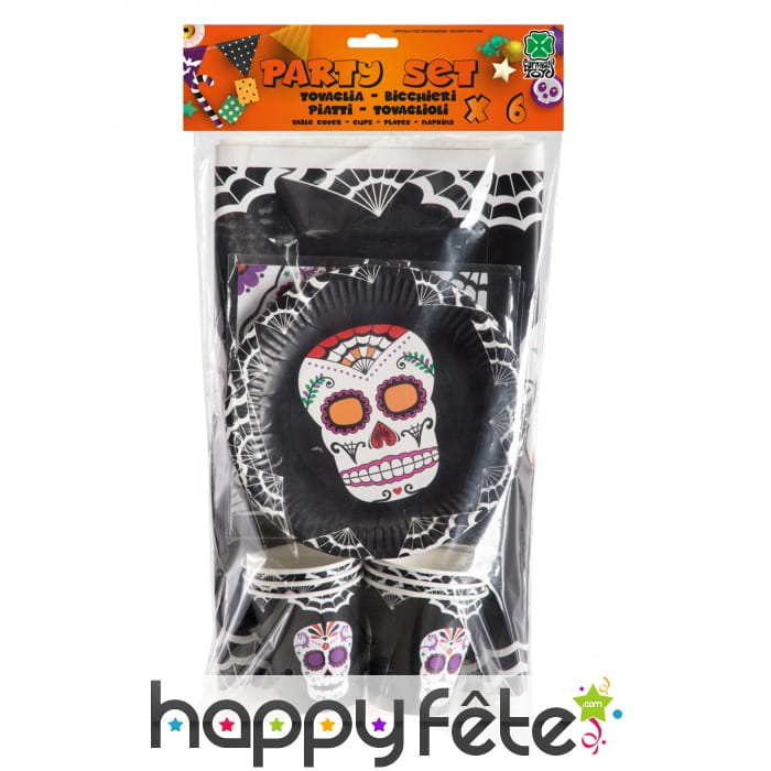 Tous les éléments sont décorés d'un crâne blanc orné de motifs floraux multicolores.