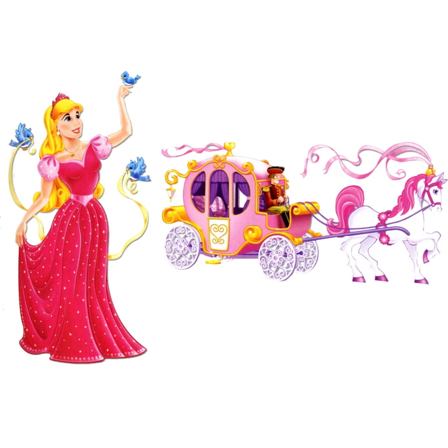 Ce set de deux décors de 1m60 à 1m62 est composé de la princesse avec trois oiseaux autour d'elle et un carrosse rose tiré par un cheval blanc et rose.