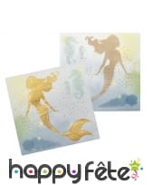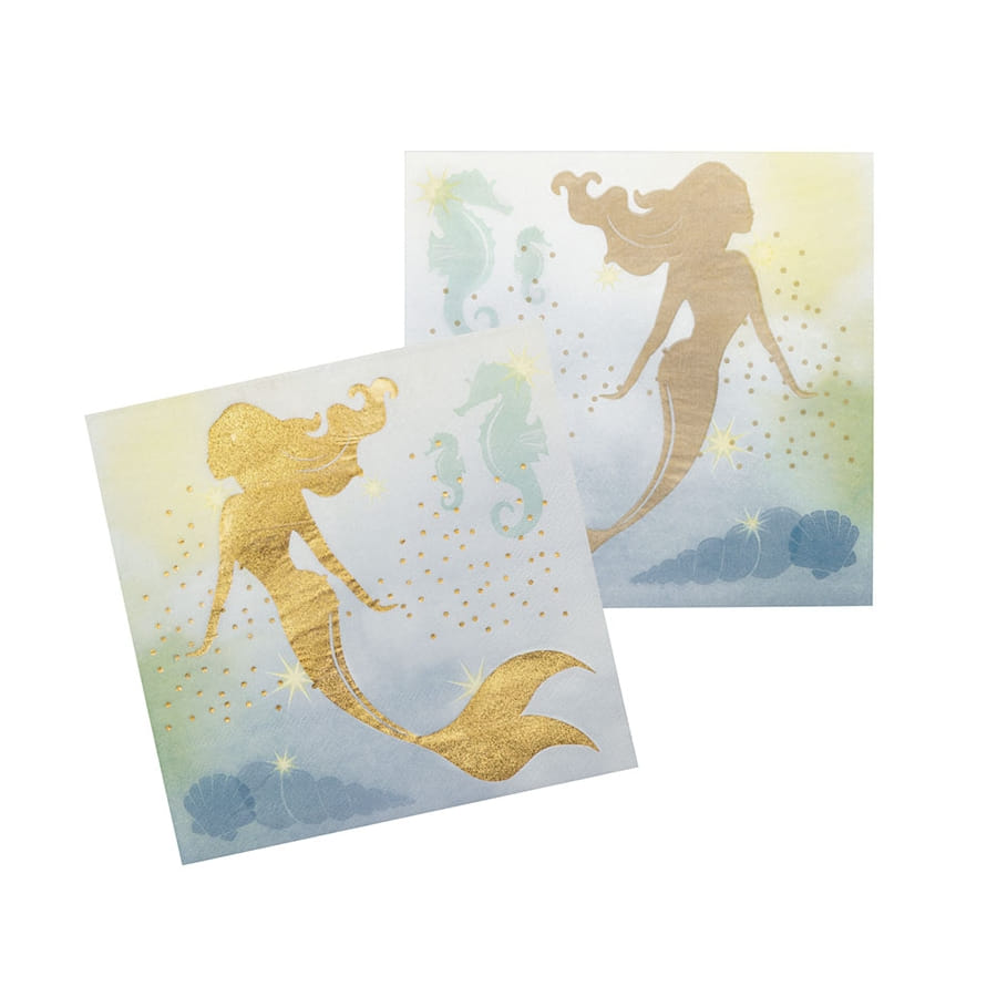 - Un set de 12 serviettes bleues imprimées de motifs sirène dorée ( 33 x 33 cm dépliées, 16,5cm une fois pliées).
