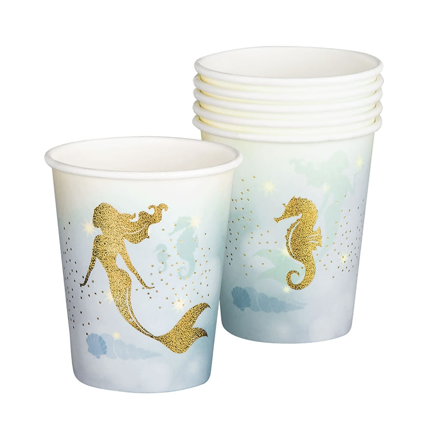 -Un lot de 6 gobelets bleus décorés de sirène dorée, chaque gobelet possède une contenance de 25 cl.
