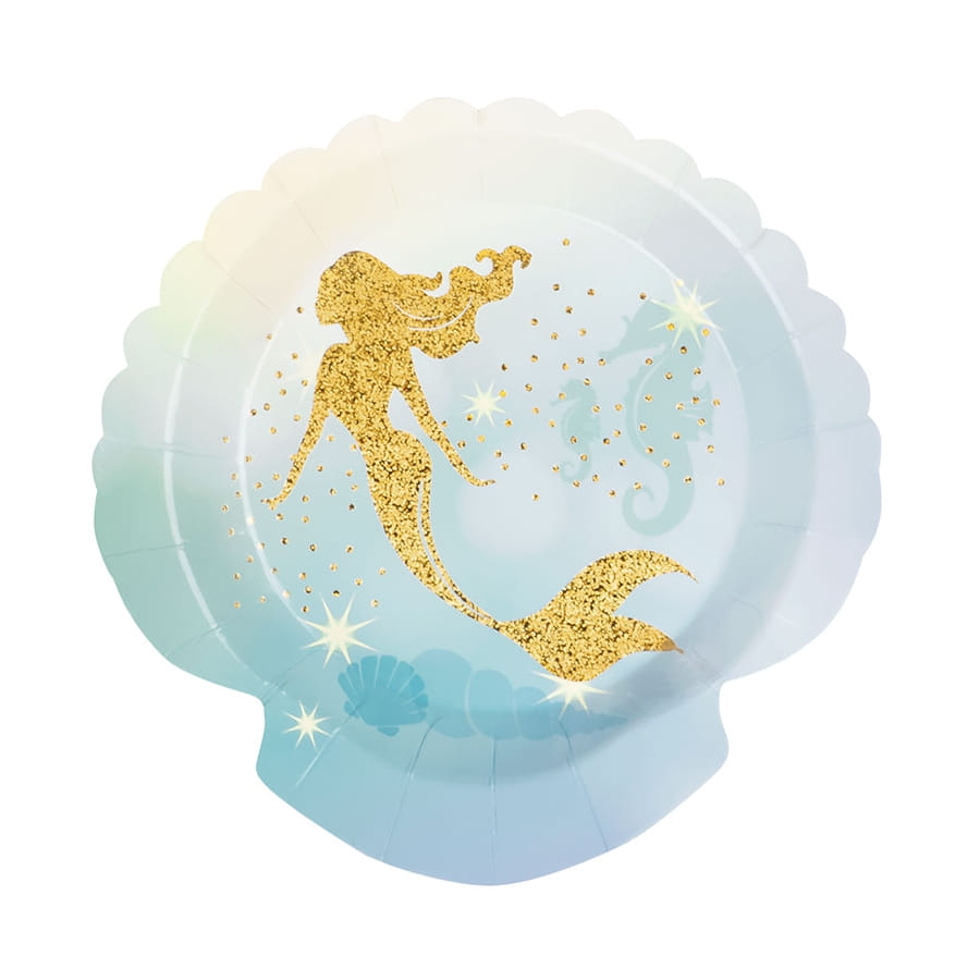 -Un lot de 6 assiettes bleues de 18 cm de diamètre, avec motifs sirène dorée;