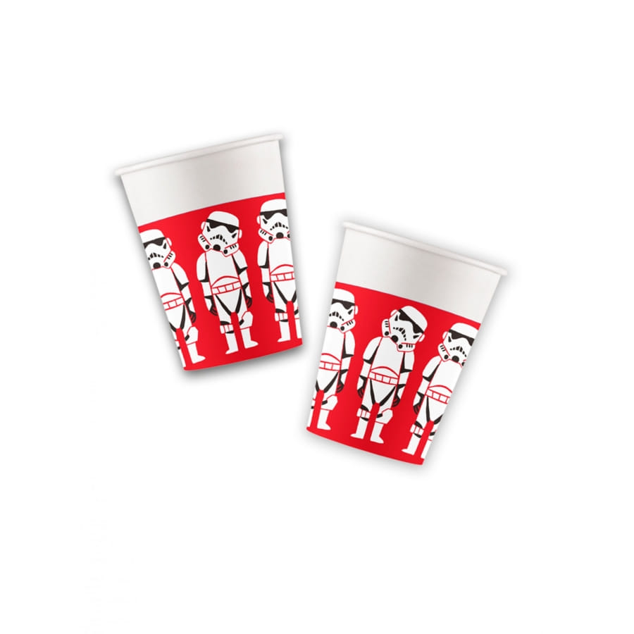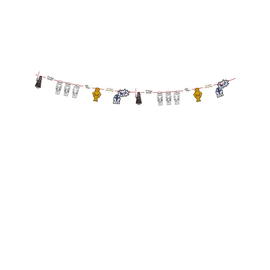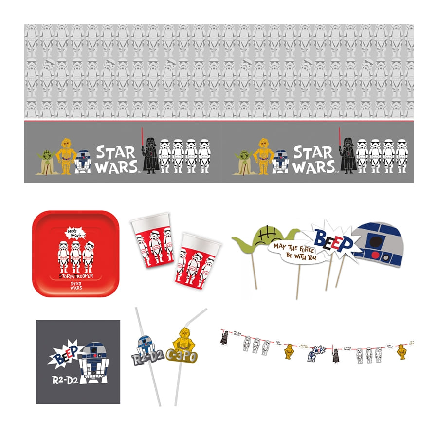 Vous aurez le choix entre 8 gobelets, 4 assiettes de forme carrée de 24 cm, 1 guirlande articulée mesurant 1 m, 6 pailles, 6 accessoires pour photobooth sur le thème Star Wars, 20 serviettes de 33 cm (une fois ouvertes) et 1 nappe de 120 x 180 cm en plastique.