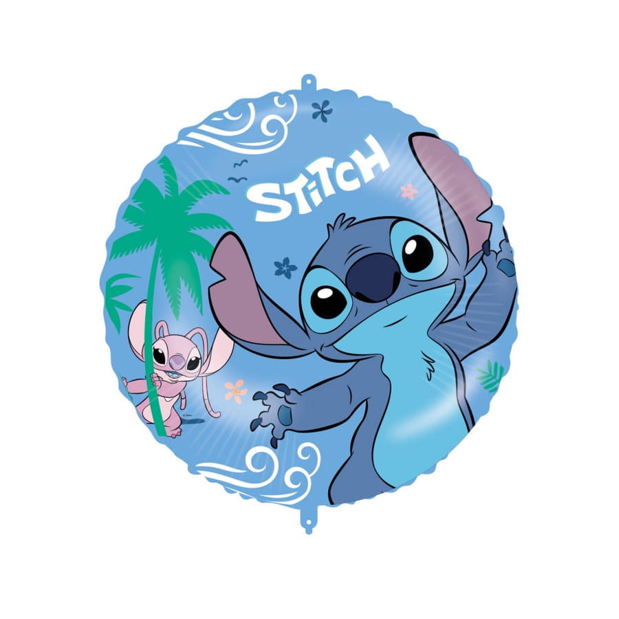 Ce ballon rond en aluminium de 46 cm de diamètre présente Stitch en premier plan et Angel en arrière-plan, sur un fond bleu. Parfait pour une décoration accrocheuse et durable.