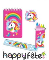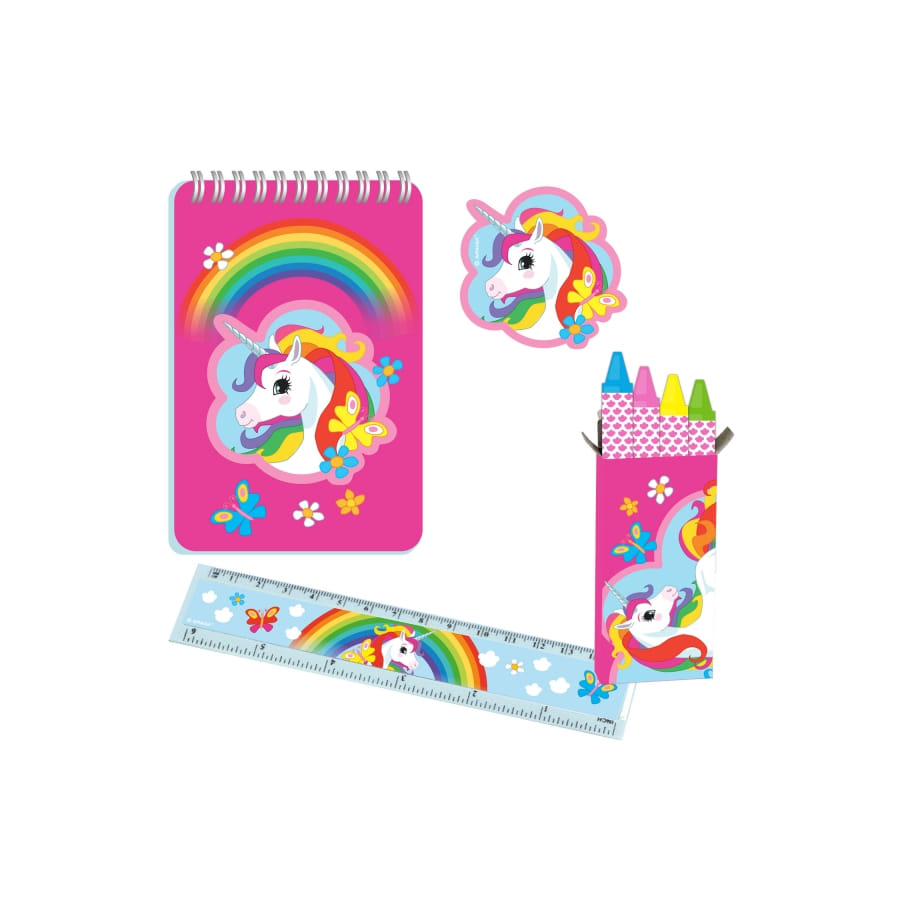Le Set de Papeterie : Décoré de licornes et d'arcs-en-ciel, ce set comprend bloc-notes, crayons colorés, règles et sachets d'autocollants. Pour que l'art rencontre la magie.