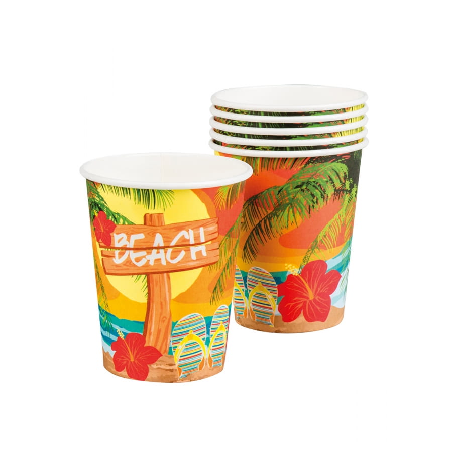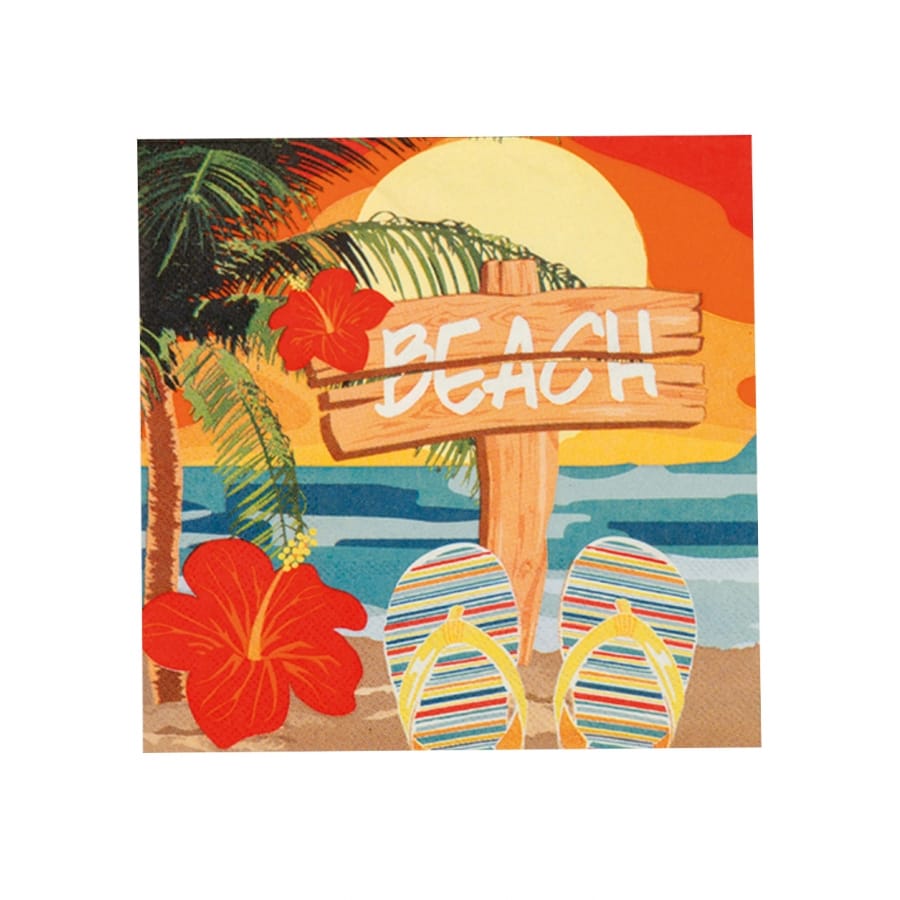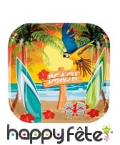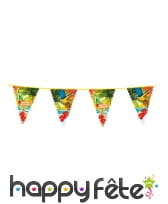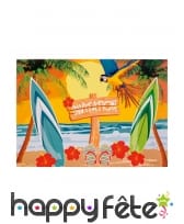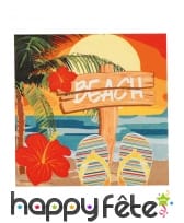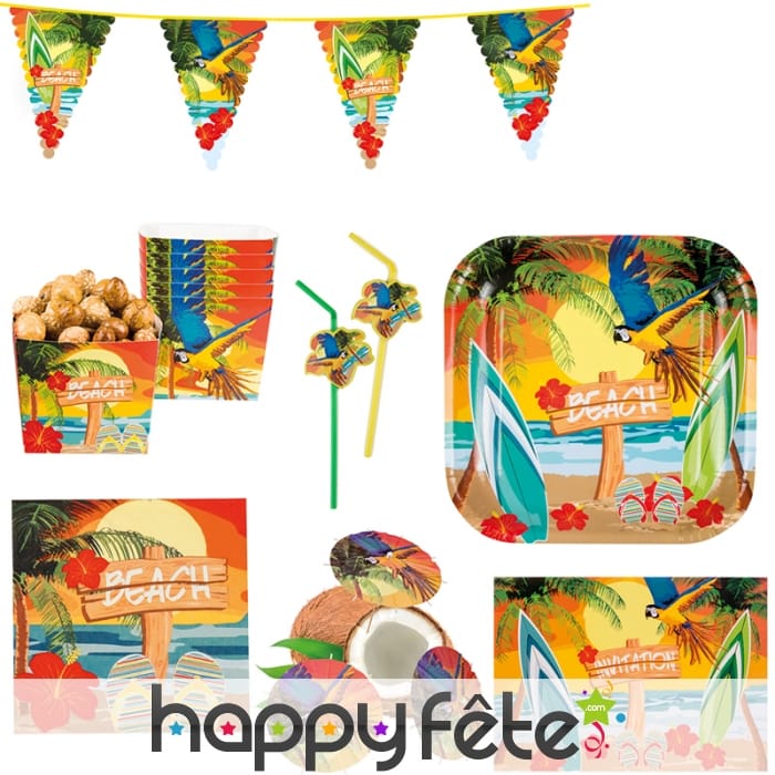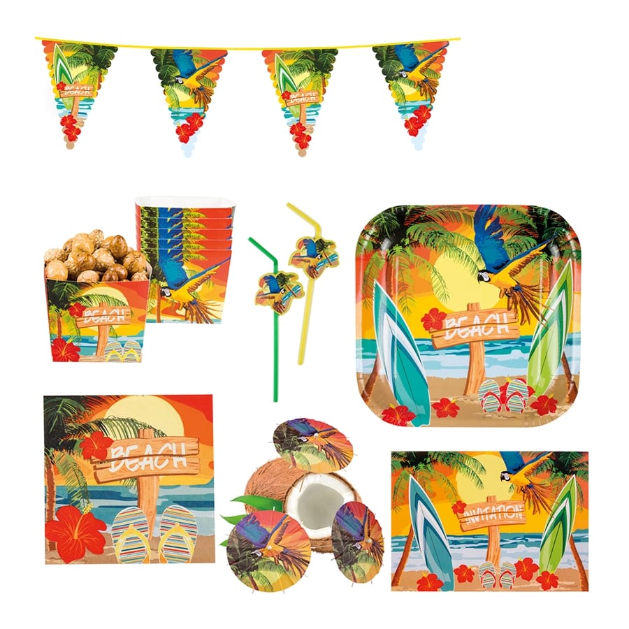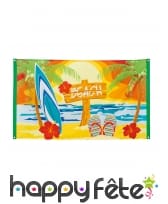 Elle est dotée de fanions triangulaires imprimés de cocotiers et d'une plage ensoleillée.