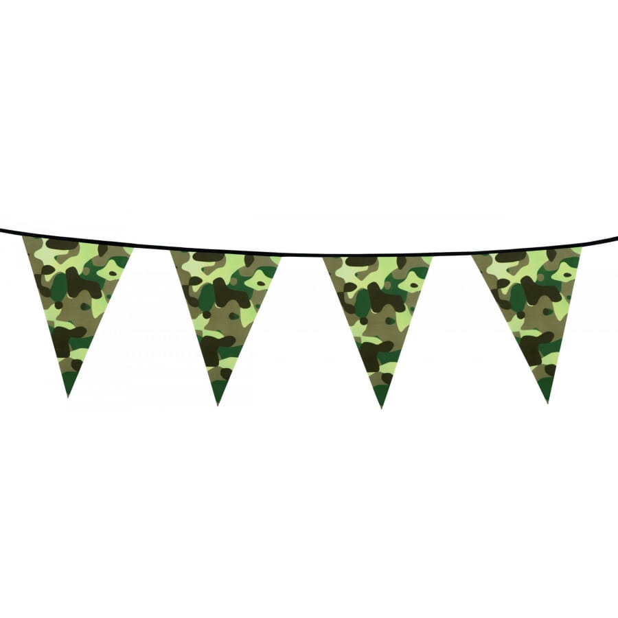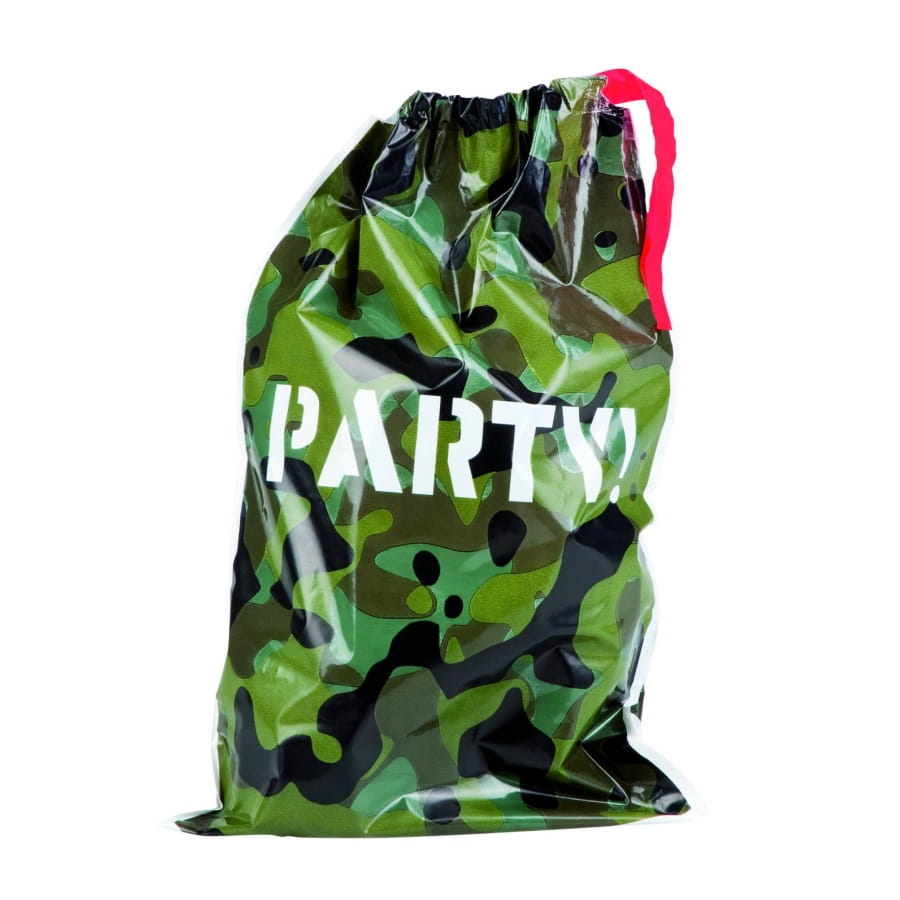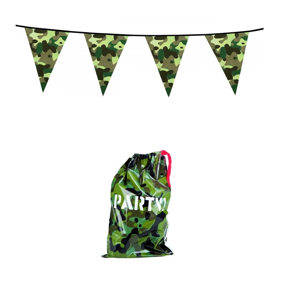 Vous pourrez choisir entre une guirlande de fanions triangulaires à imprimés militaires faisant 6 mètres de long, ou un lot de 6 sacs type armée conçus en plastique, chacun mesurant 23 x 15 cm.