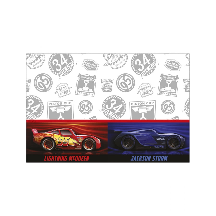 Le côté est orné des personnages Flash McQueen sur fond rouge et Jackson Storm sur fond bleu.