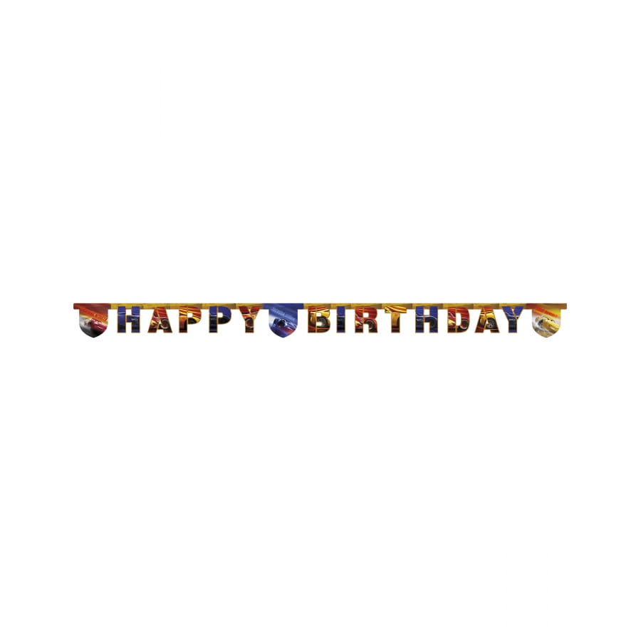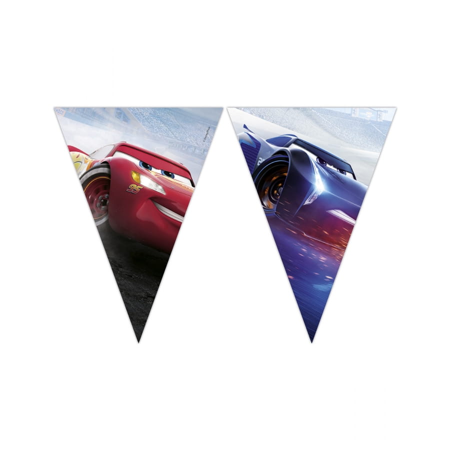 - 1 guirlande en plastique dotée de 9 fanions triangulaires sur lesquels sont imprimés Flash McQueen ou encore son éternel rival Jackson Storm.