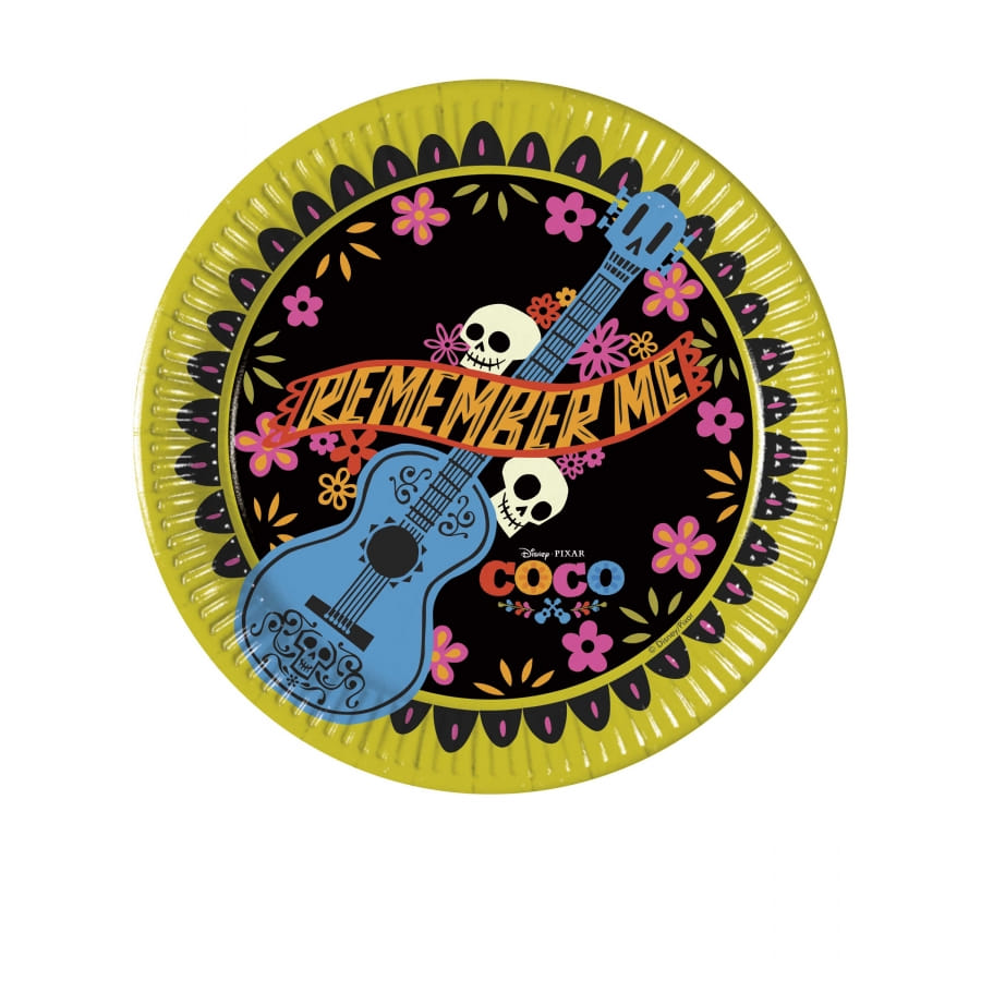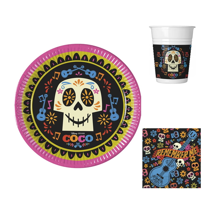Il s'agit d'un ensemble de couverts de table composé de 8 assiettes mesurant 23 cm, 8 gobelets, 20 serviettes (33 cm une fois dépliées) et 8 petites assiettes de 20 cm de diamètre environ. Ces assiettes de couleur noire et verte, sont imprimées de petites fleurs, de têtes de mort, et d'une guitare. L'inscription "Remember me" est également visible au centre de ces 8 petites assiettes.