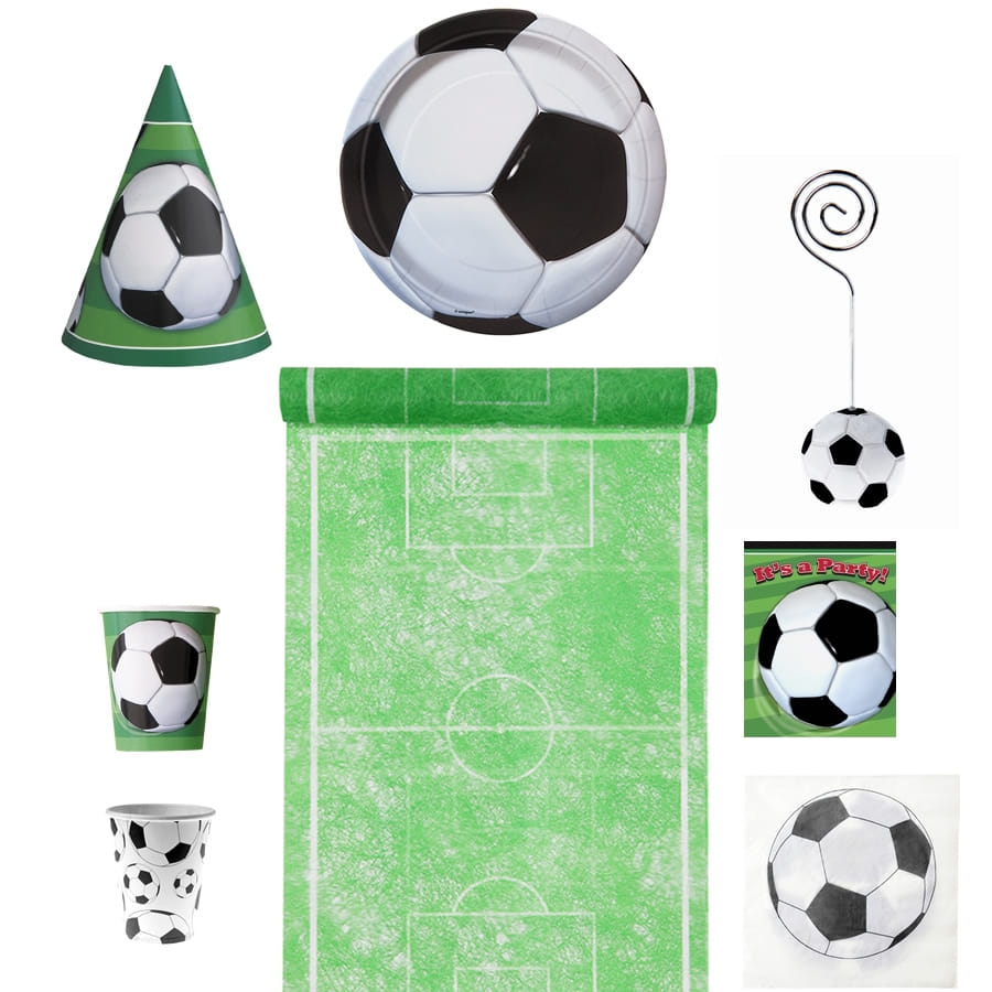 Organisez le plus inoubliable des anniversaires pour un fan du ballon rond. Epatez tous les invités en utilisant ces décorations foot de table pour enfant. Plusieurs éléments au choix sont proposés avec un motif ballon de foot au centre imprimé sur fond vert. Vous pourrez ainsi choisir entre un lot de 8 chapeaux, un assortiment de 8 gobelets, 8 cartons d'invitation, 8 petites assiettes, une banderole, un ensemble de 8 gobelets et d'assiettes, une nappe en plastique et 8 sacs cadeau.