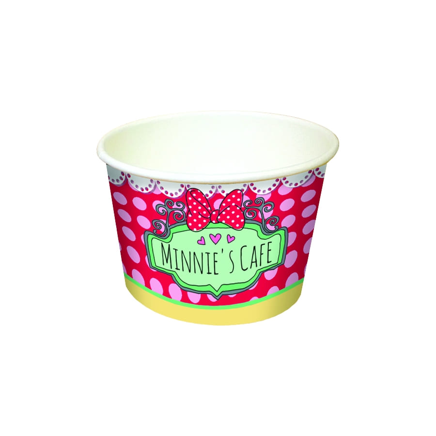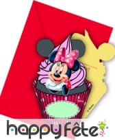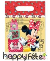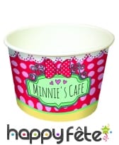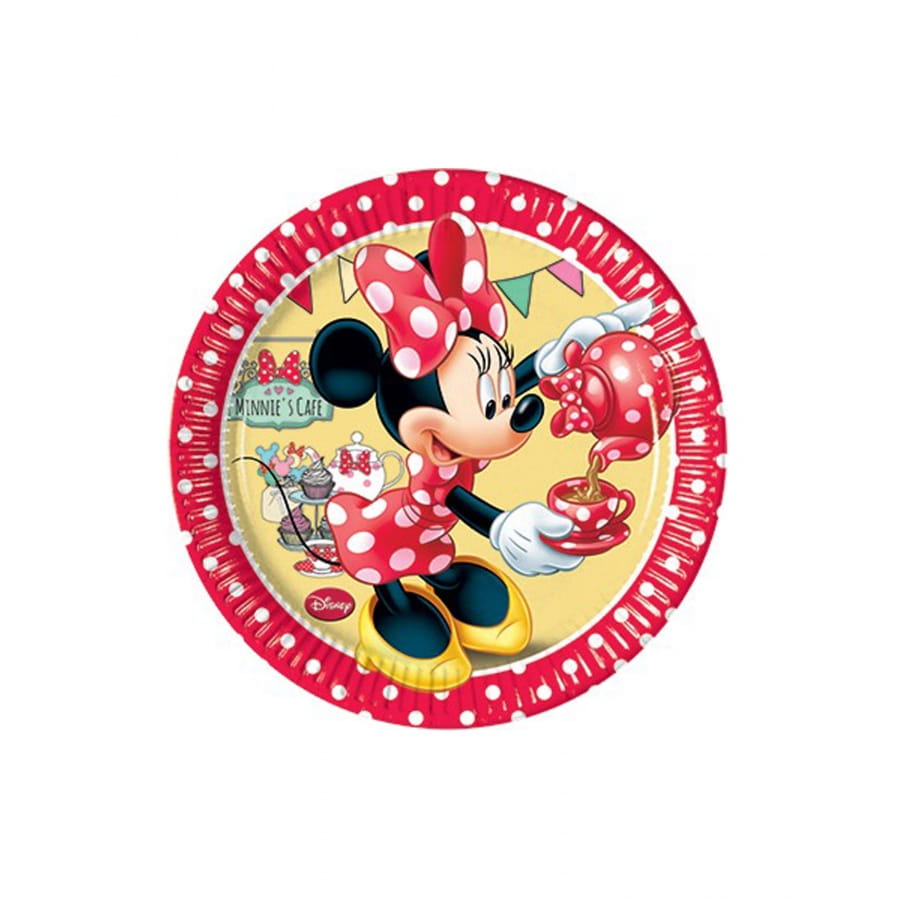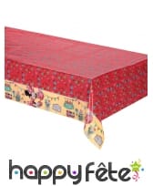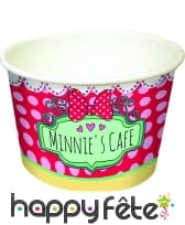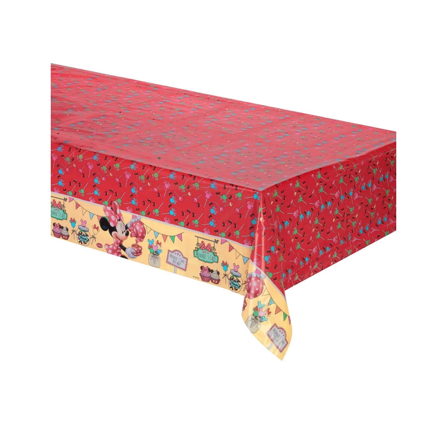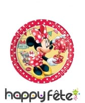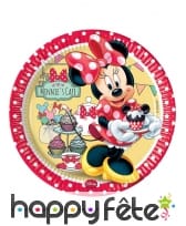 La bordure est rouge à pois blancs tandis que le centre est imprimé de Minnie servant u thé.