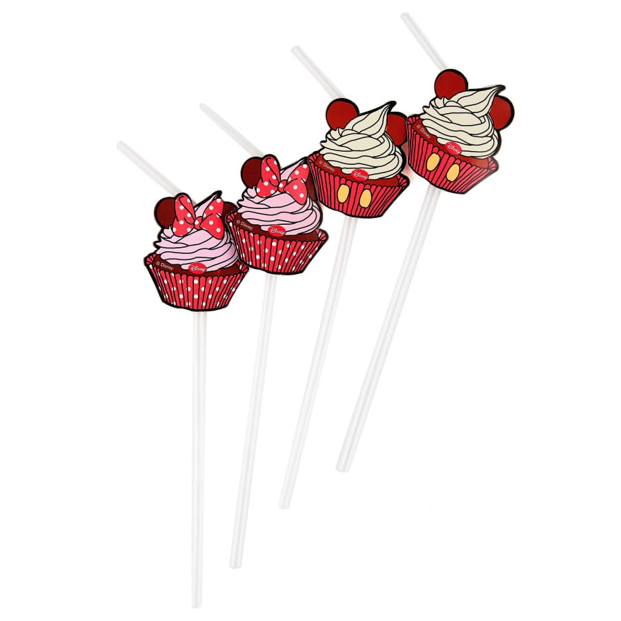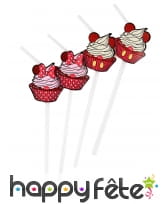 - 6 pailles en plastique surmontées de vignettes en carton représentant des cupcakes.