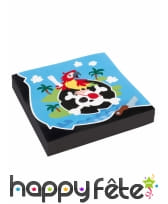 Premièrement, permettez-moi de vous présenter nos serviettes en papier, qui ne manquent certainement pas de style. Mesurant 33cm de côté lorsqu'elles sont dépliées, elles présentent un emblème pirate amusant en plein centre. Imaginez : un crâne blanc sur fond noir, souriant à pleines dents. Juste au-dessus, un perroquet facétieux tient fièrement une carte au trésor. Ah, et ne vous laissez pas distraire par cette charmante île et ce ciel azur en arrière-plan ! Tout autour, un liseré noir rappelle l'univers mystérieux des pirates.