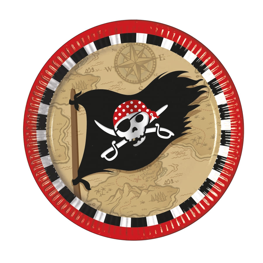 Aventurez-vous sur des flots inconnus avec un lot de décorations pirates pour table d'anniversaire. Elaborez un décor unique inspiré de l'univers des pirates, avec un beau mélange de rouge, de blanc et de marron accompagné de motifs tête de mort et bateau pirate. L'article propose trois différents éléments au choix : un paquet de 20 serviettes en papier à 2 plis mesurant 33 x 33 cm chacun, un assortiment de 8 gobelets en plastique d'une capacité de 200 ml chacun, et un lot de 8 assiettes en carton de 23 cm de diamètre chacun.