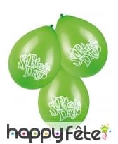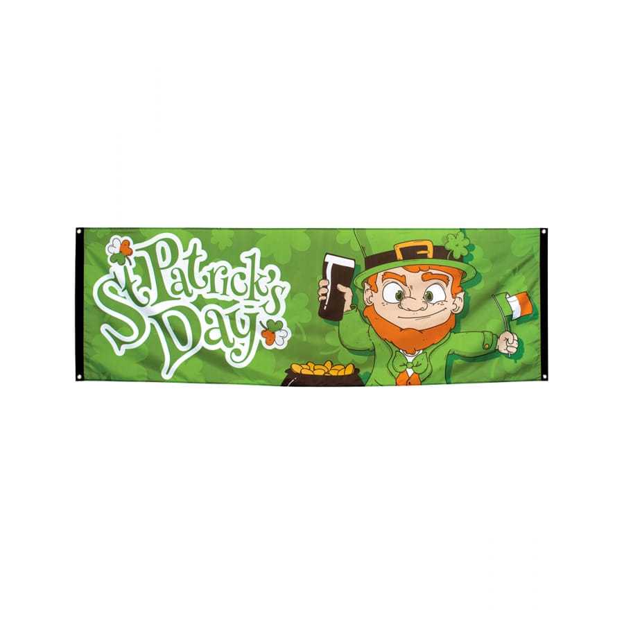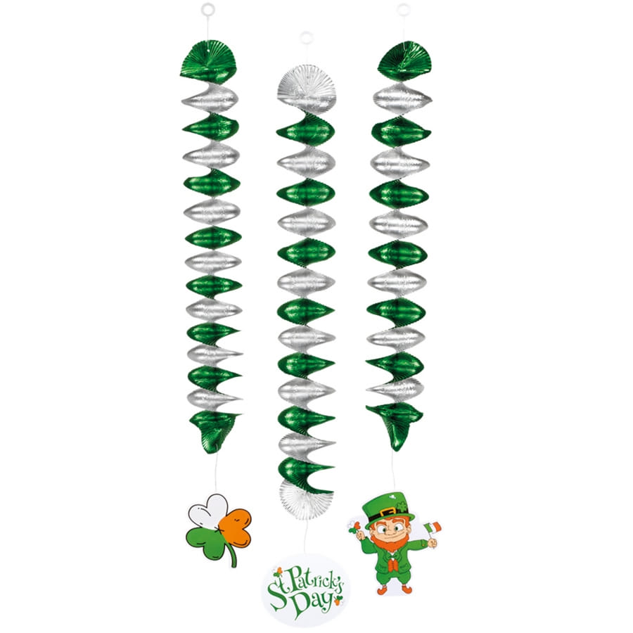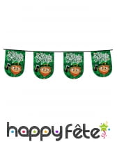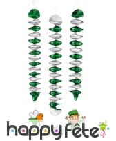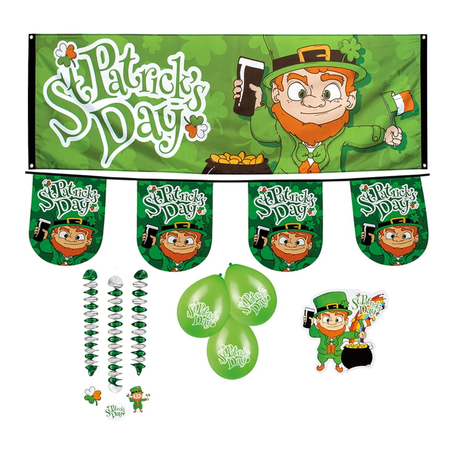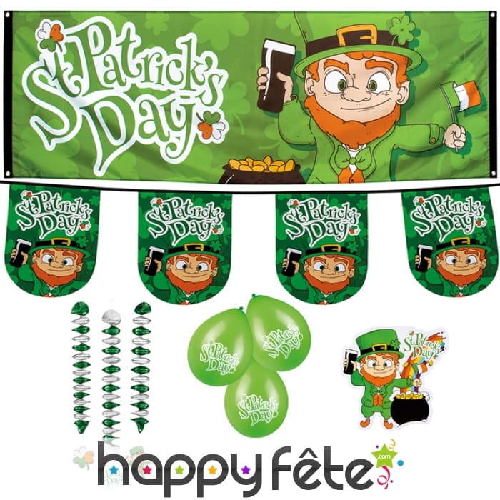 Pour ces décorations vous pourrez choisir entre: 1 banderole de 220 x 74 cm avec 4 oeillets pour le passage des ficelles d'accrochage, 3 suspensions spirales de 60 cm imitation métal, 1 décoration murale représentant le lutin de la St patrick, 1 guirlande (6m de longueur), 6 ballons de 25 cm.