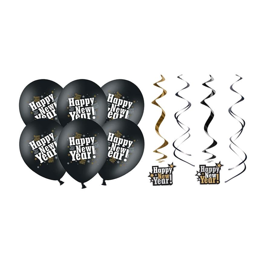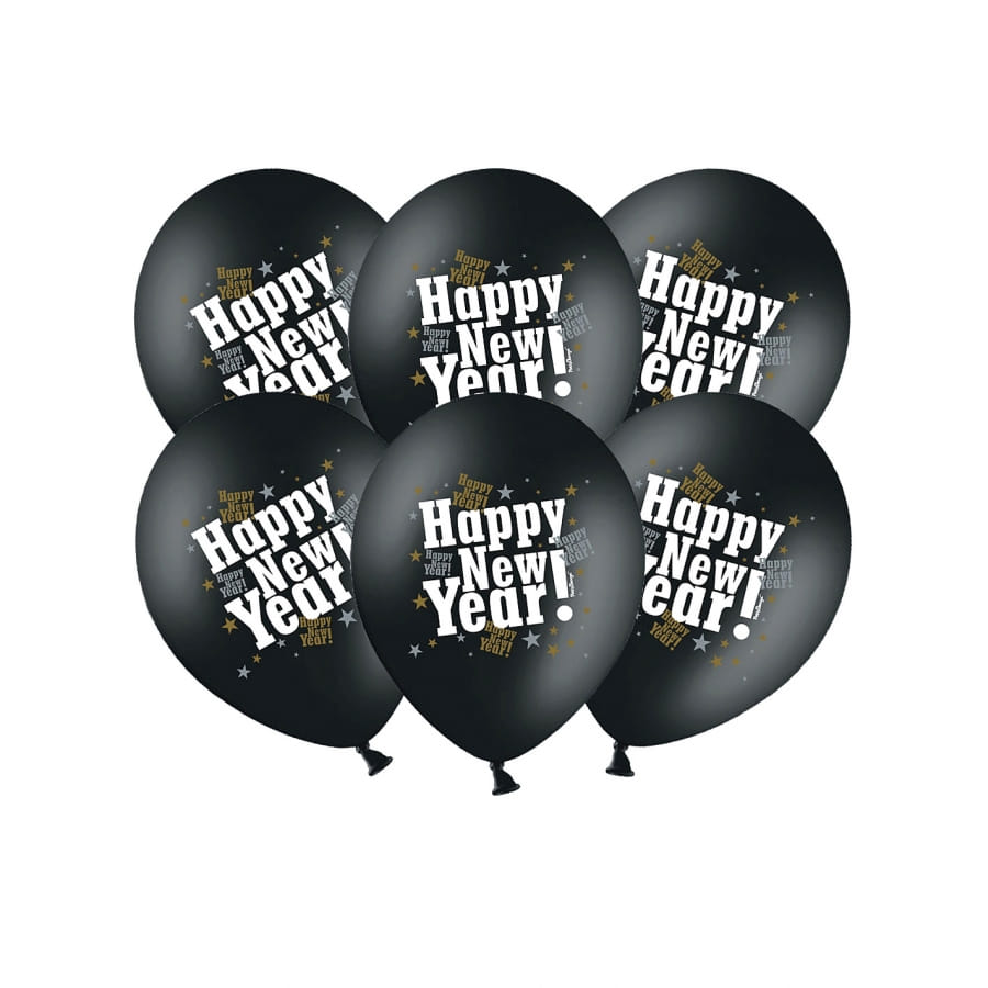 Chaque ballon fait un diamètre de 30 cm et présente les mots "HAPPY NEW YEAR!" en lettres blanches sur fond noir.