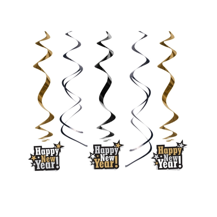 Au bout de chaque spirales est accroché une vignette portant l'inscription "HAPPY" en lettres dorées et "NEW YEAR!" écrit en blanc.