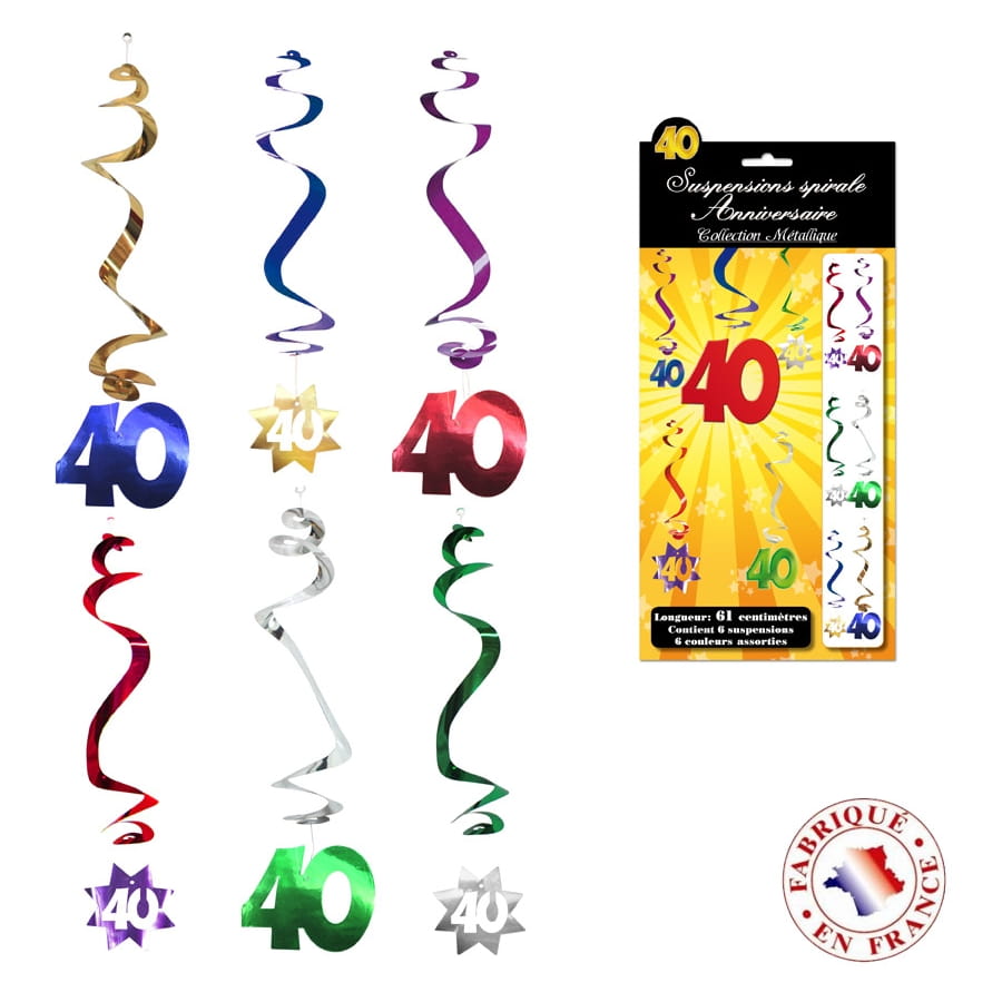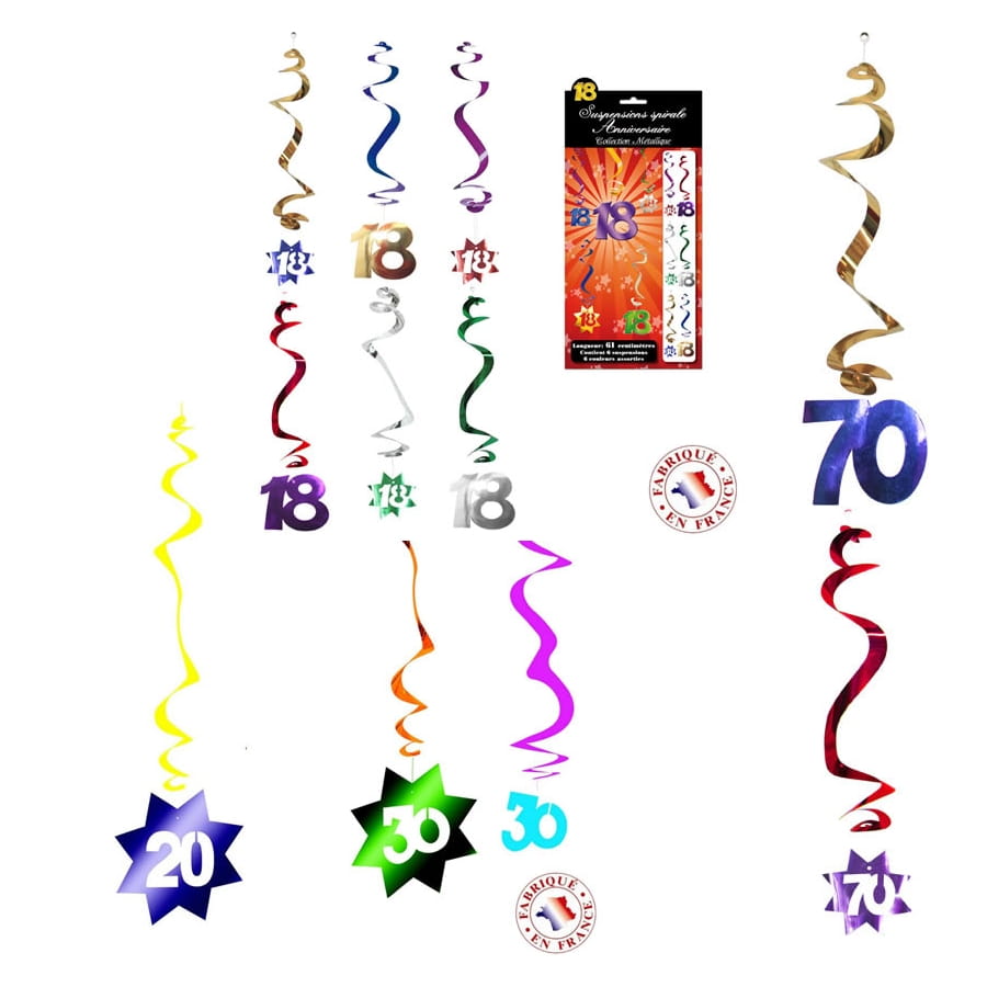Des couleurs un peu partout accompagnées du nombre d'années à célébrer, en voilà une déco originale ! Les décorations spirales d'anniversaire à suspendre sont fournies par lot de 6 suspensions. Chacune d'elles mesure 61 cm de longueur. Il s'agit de petits tourbillons brillants et colorés équipés du nombre 18, 20, 30, 40, 50, 60 ou 70 au choix.