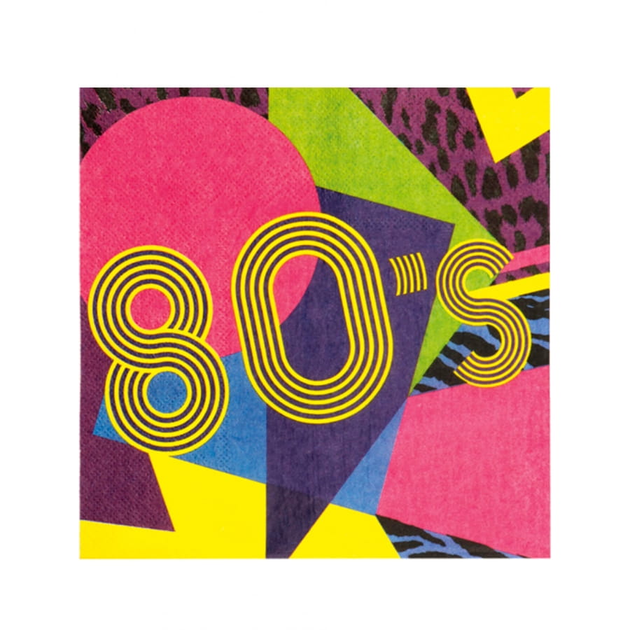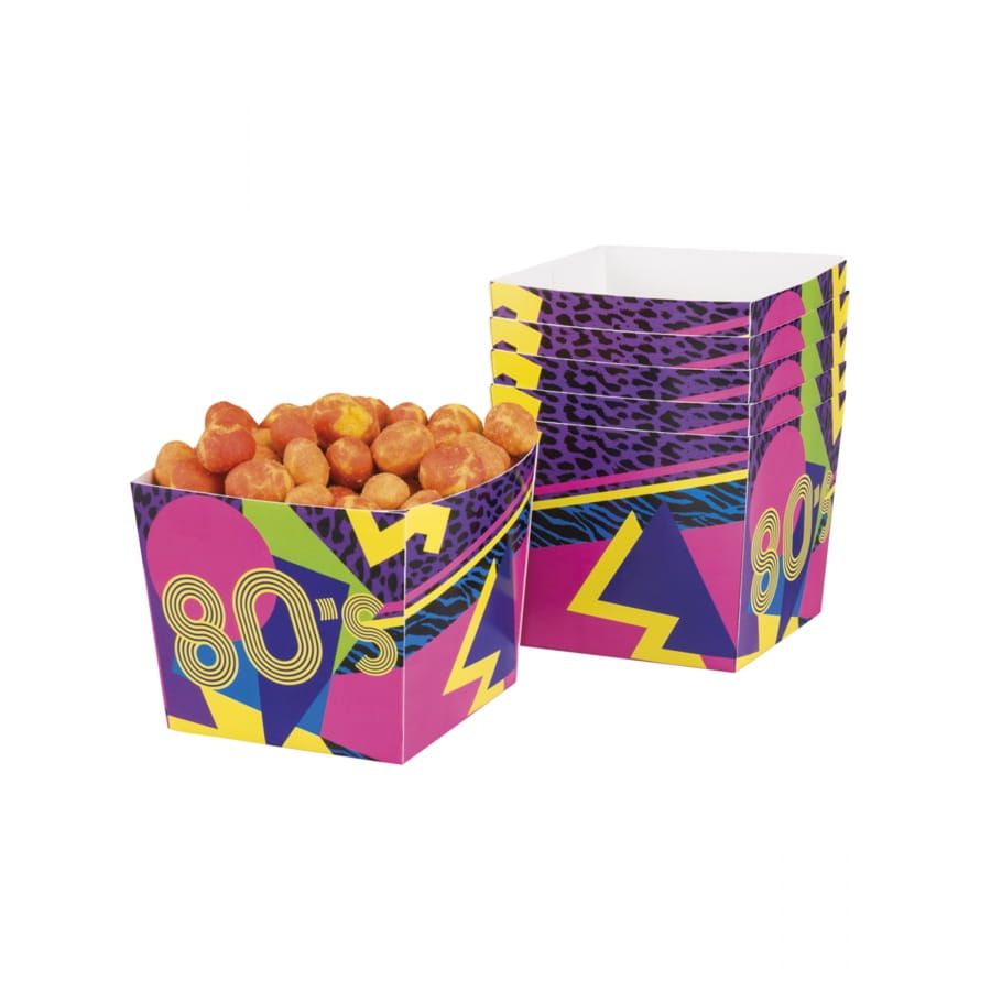 Un lot de 6 gobelets à bonbons en carton (9 x 7 cm ) et de 12 serviettes en papier (33 x 33 cm une fois dépliées) décoré selon le thème année 80.