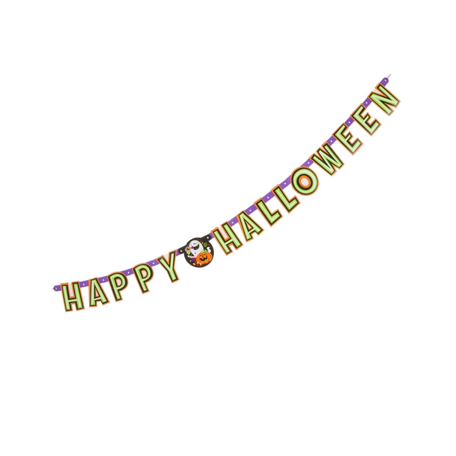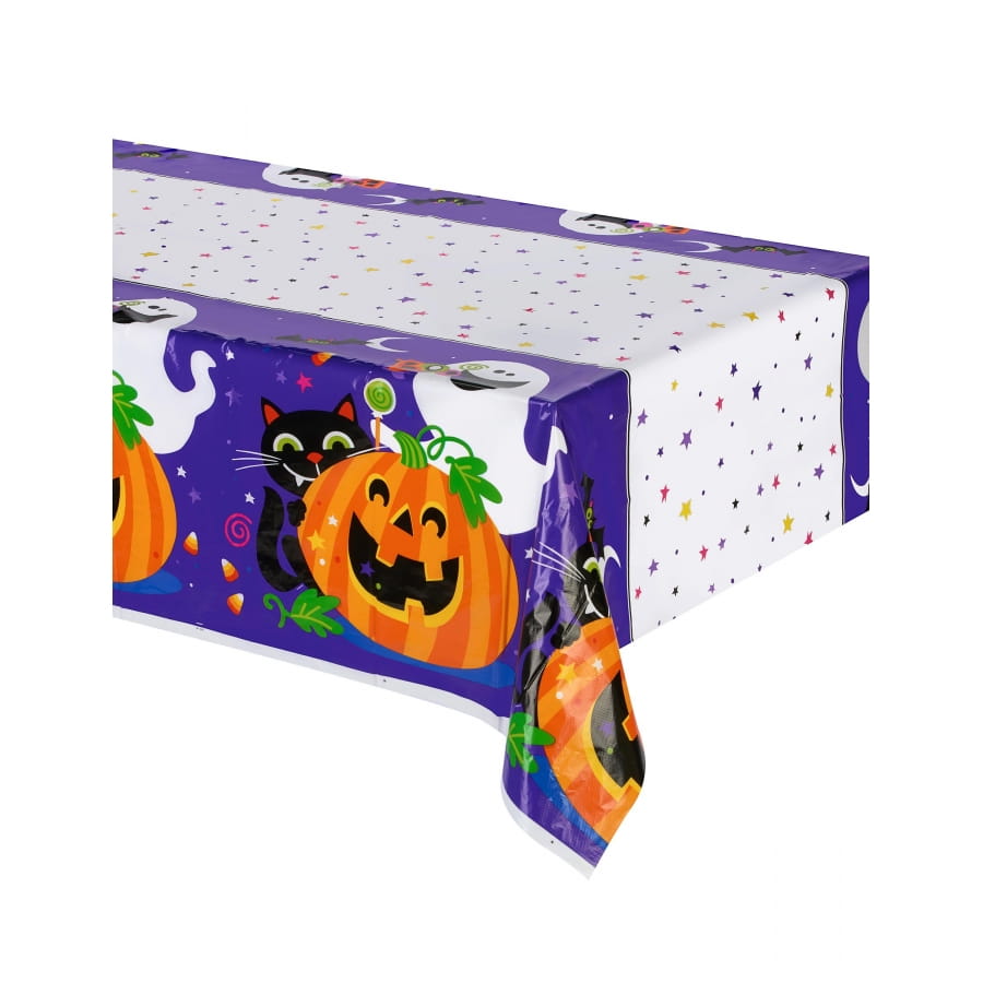 On trouve: une nappe en plastique, 2 lots de 8 assiettes en carton chacun avec des diamètres différents, 8 gobelets et une guirlande articulée souhaitant un " HAPPY HALLOWEEN".