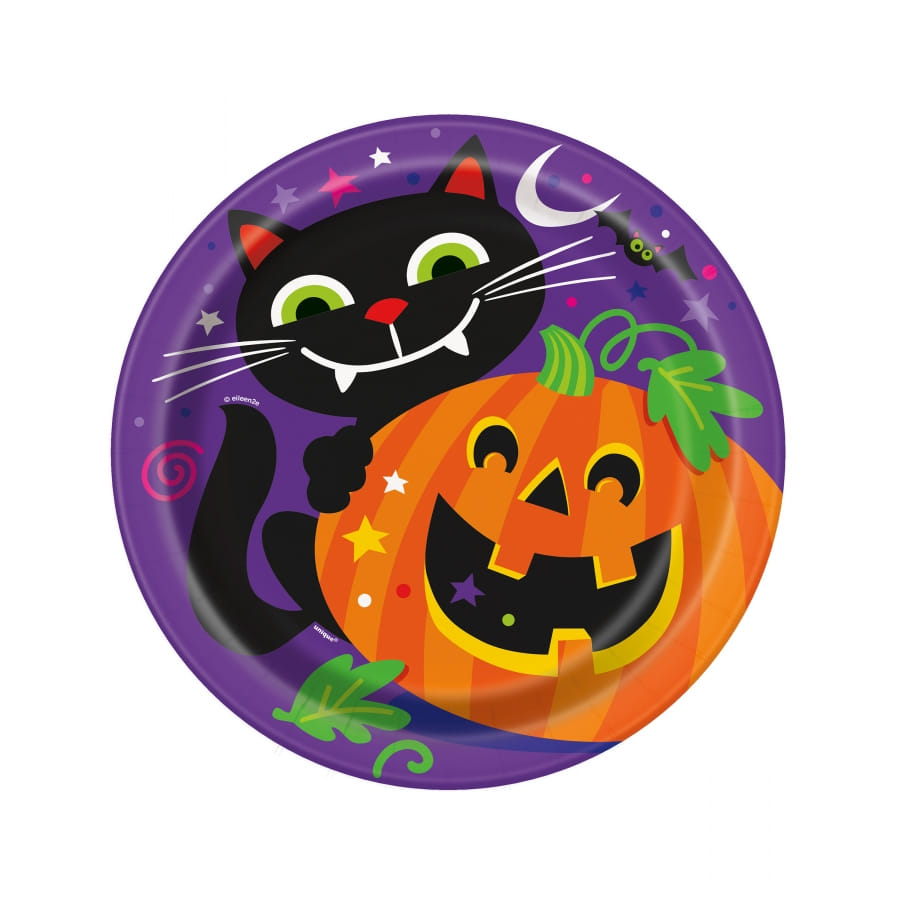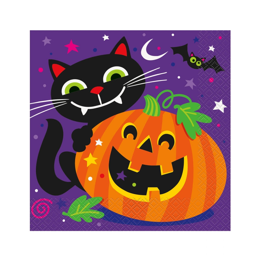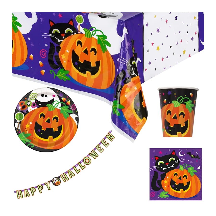 La décoration citrouille et chat pour table de Halloween est un ensemble de couverts et d'ornements au choix.