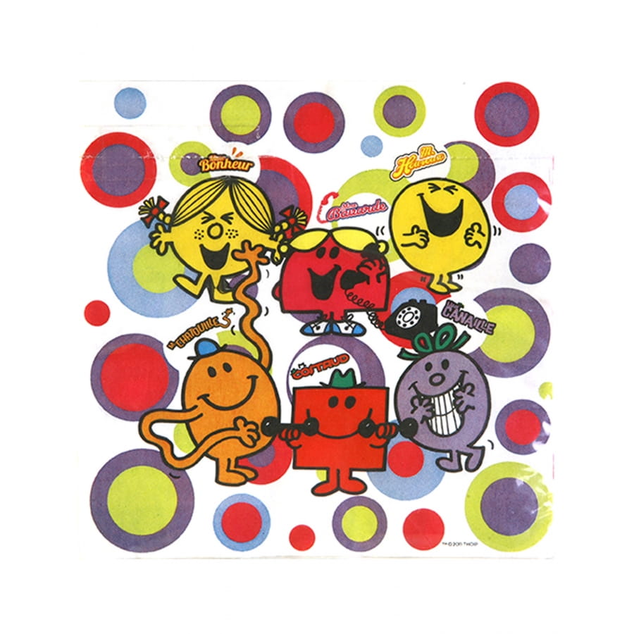 M Heureux, Mme Bavarde, M Costaud, M Chatouille, Mme Bonheur et encore plein d'autres personnages sont rassemblés à travers de magnifiques décos Monsieur madame de table d'anniversaire. Ces accessoires riches en couleurs, sous licence officielle Monsieur Madame, vous offriront un anniversaire riche en émotions ! Plusieurs éléments au choix sont disponibles. Découvrez un assortiment de 6 assiettes en carton, de 23 cm de diamètre chacune, avec motifs Mme Bavarde au téléphone et M Heureux qui rigole. Retrouvez aussi un lot de 20 serviettes en papier de couleur blanche avec motifs Monsieur Madame. Une fois dépliée, chaque serviette fait 33 x 33 cm de dimension. Vous pouvez aussi opter pour des gobelets en carton, de 25 cl de capacité chacun. Vous disposerez de 6 unités décorés d'images Monsieur Madame avec des tons roses, orange et jaunes sur un fond blanc. Une nappe en plastique d'environ 130 x 180 cm, très facile à nettoyer, vous est aussi suggérée. Les personnages y sont dessinés sur un fond blanc. 6 cartons d'invitation Monsieur Madame accompagnés de 6 enveloppes blanches sont aussi inclus dans l'article. Il vous est également possible de commander la petite collection de sacs à bonbons en plastique. L'article compte 6 unités et chaque sac fait 23 cm de long et 15,5 cm de large. Disposez aussi de 6 ballons de couleur orange et verte à gonfler avec les personnages imprimés sur la face avant. Pour terminer, le kit de 25 pièces comporte divers éléments colorés à l'effigie de Monsieur Madame.