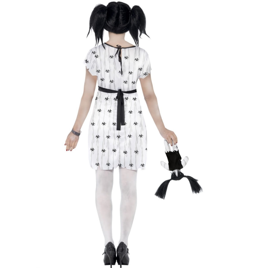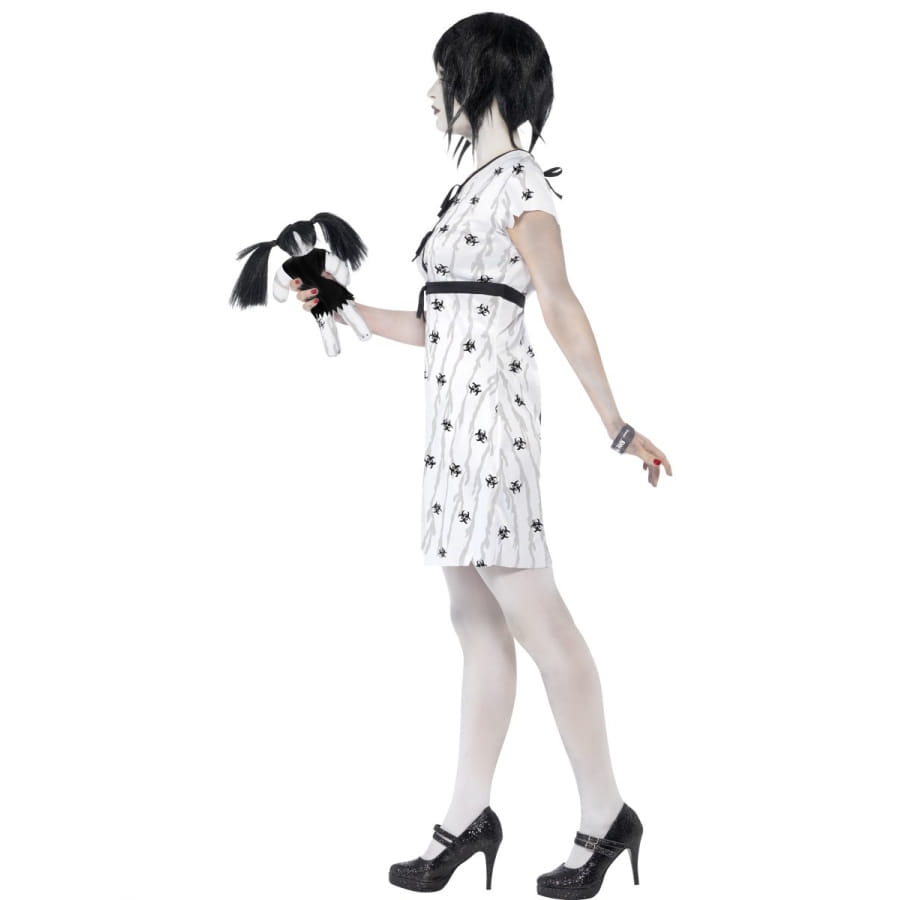 Déguisement d'Abby, pour femme, composé d'une robe, d'une poupée et d'un bracelet. L'ensemble est disponible en taille S, M ou L. Avec ce déguisement, vous aurez l'air d'une parfaite poupée zombie effrayante à souhait.
