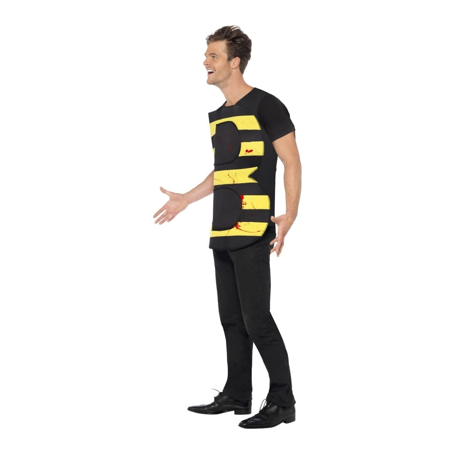 Un déguisement d'abeille tueuse vous pourrez le mettre pour Halloween, ou une fête ayant pour thème horreur, il est composé d'un tabard qui a la forme de la lettre B de couleur jaune et noire avec des taches de sang dessus.