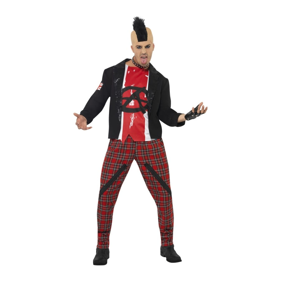 Déguisement d'anarchiste, pour homme, composé d'un top rouge et blanc, d'une veste noire et d'un pantalon à carreaux rouges. Le tout est disponible en taille S, M ou L. La veste porte une insigne en forme de drapeau d'Angleterre et un col en paillettes. Ce déguisement complet fera de vous un punk des années 80 parfait.