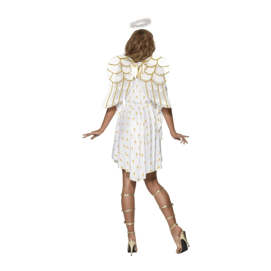 Déguisement Fever d'ange, pour femme, composé d'une robe porte-feuille, d'une paire d'ailes et d'un halo en marabout. La robe est ornée de motifs et d'une ceinture dorés. Elle est disponible en taille S, M ou L. Elle sera idéale pour une fête religieuse.