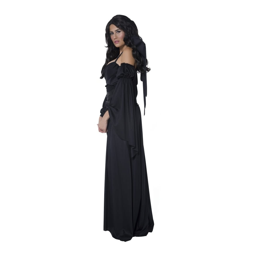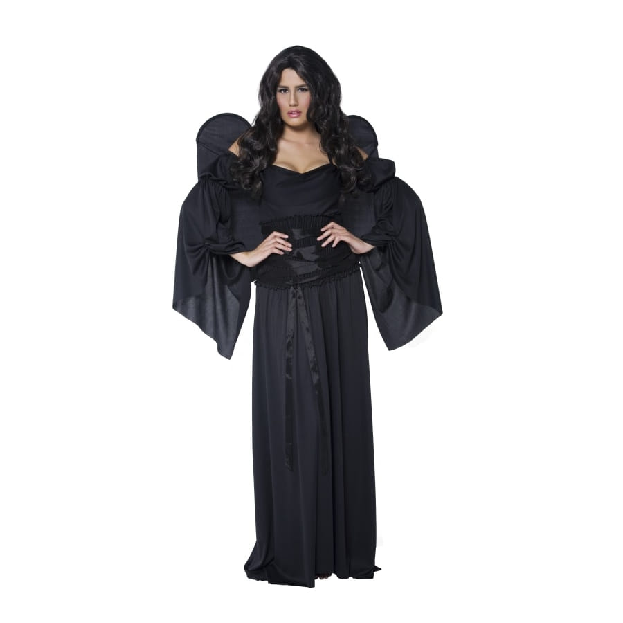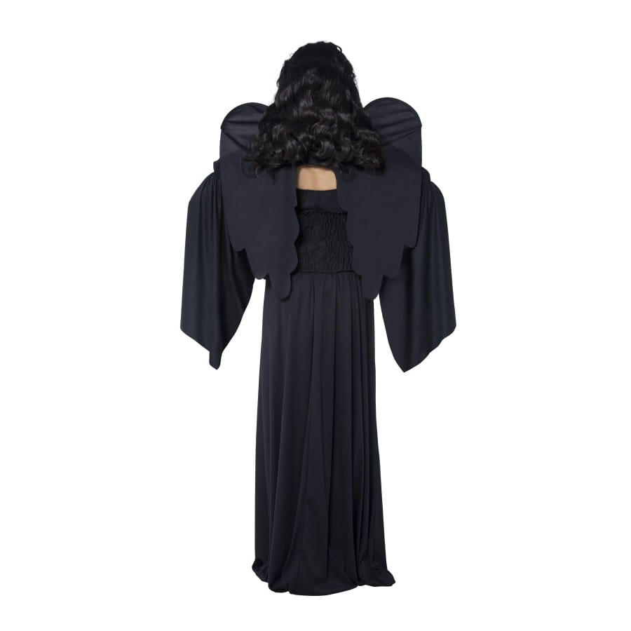 Déguisement d'ange de couleur noire, pour femme, composé d'une longue robe avec manches évasées et d'une paire d'ailes. Cet ensemble est disponible en taille S, M ou L au moment de la commande. Vous pouvez l'utiliser pour une fête basée sur les contes de fées, sur un thème gothique ou de magie et de sorcellerie.